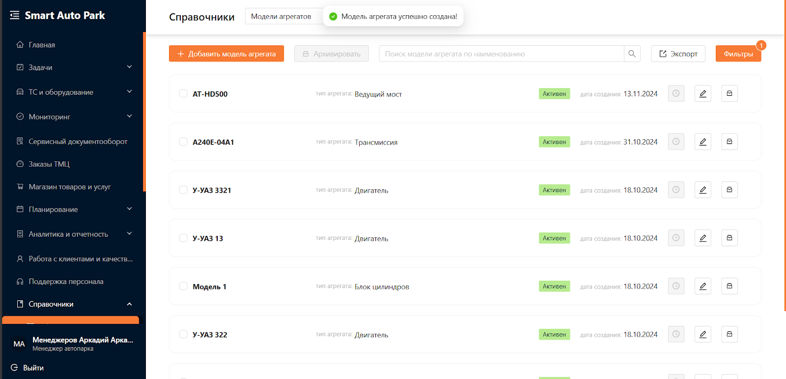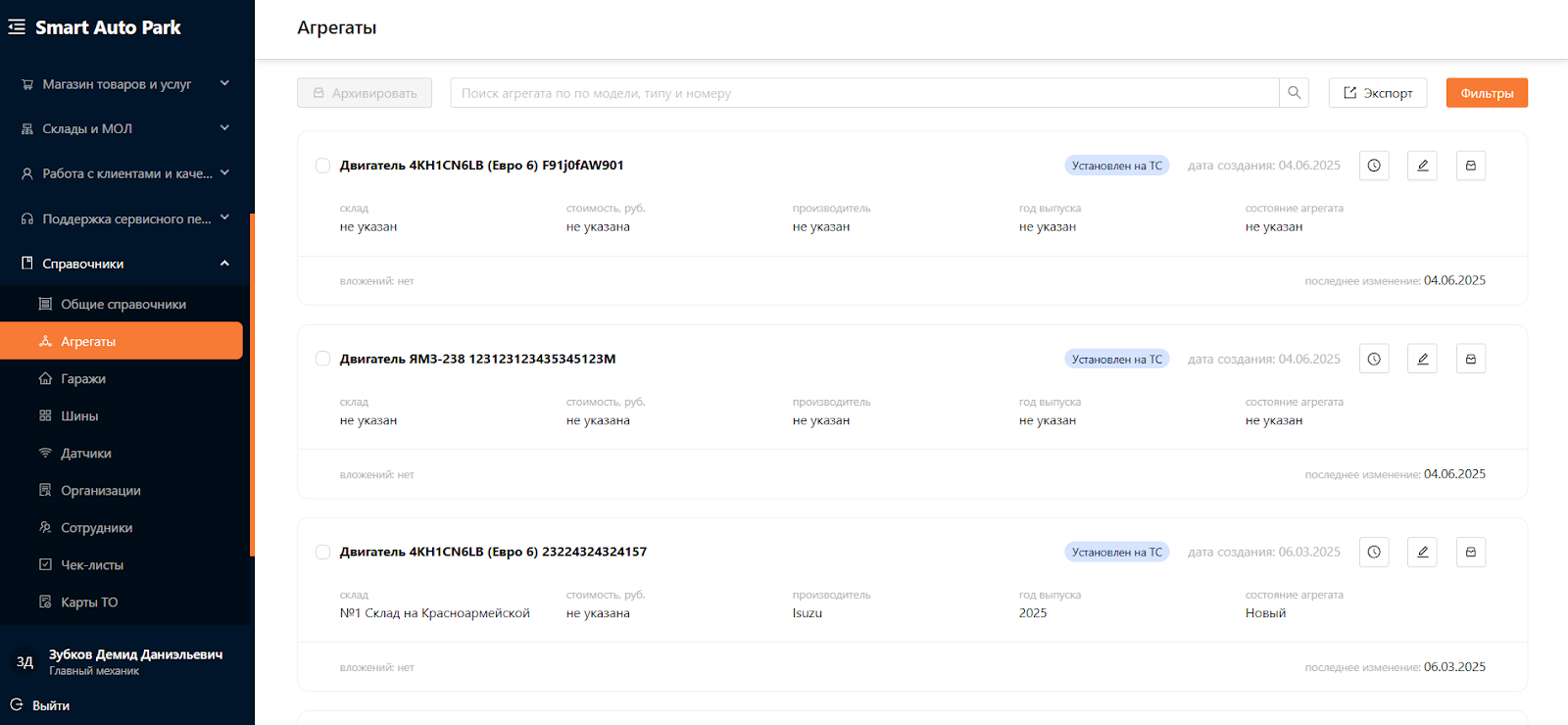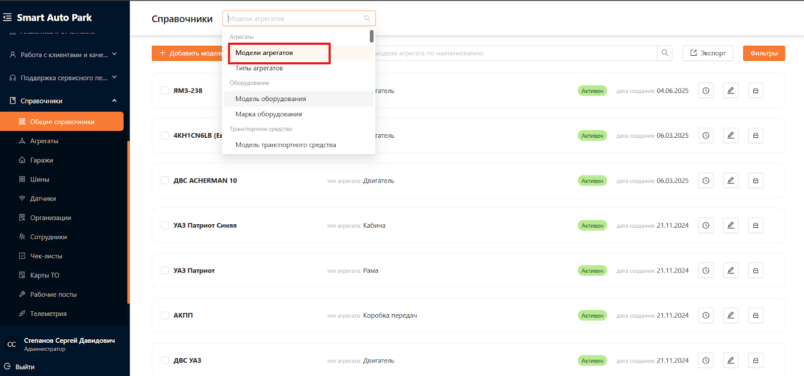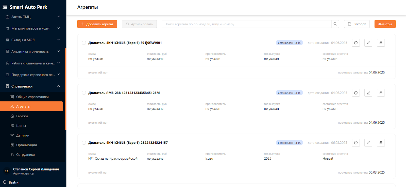 Система для управления автопарком предназначена для автоматизации и оптимизации всех аспектов эксплуатации и обслуживания транспортных средств и оборудования. Система является комплексным решением, охватывающим всю деятельность, связанную с управлением автопарка, от учета и мониторинга транспортных средств до планирования и аналитики. Одним из подразделов Системы является “Агрегаты”.