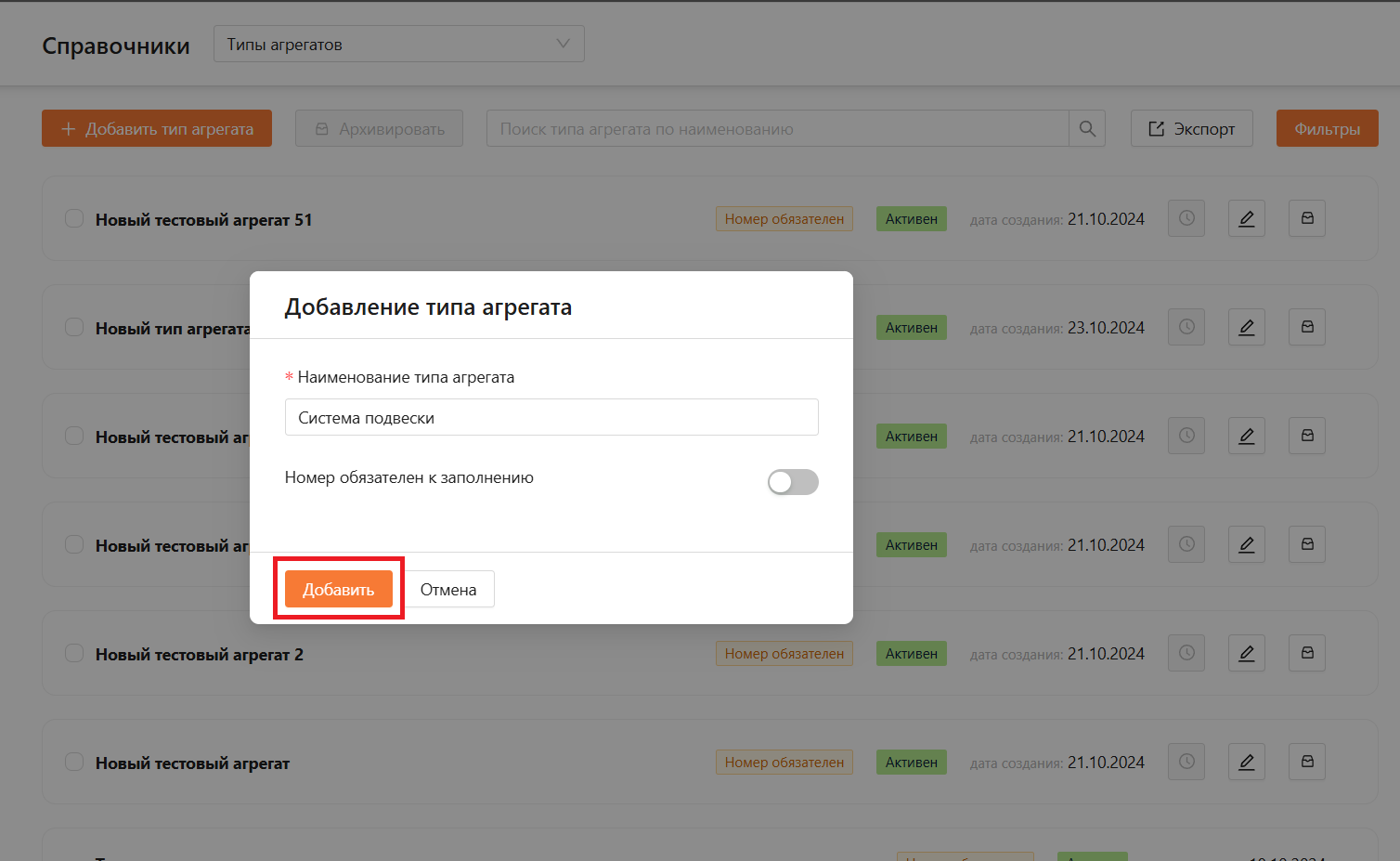 Заполняем обязательное поле в типе агрегата и нажимаем на кнопку “Добавить” (см. рисунок 11).