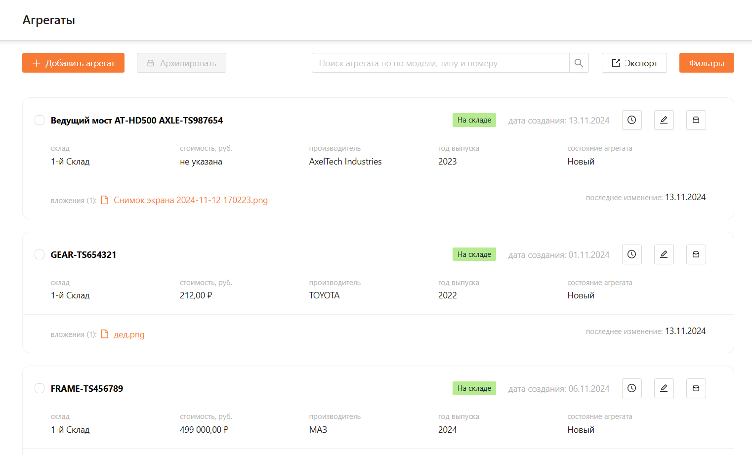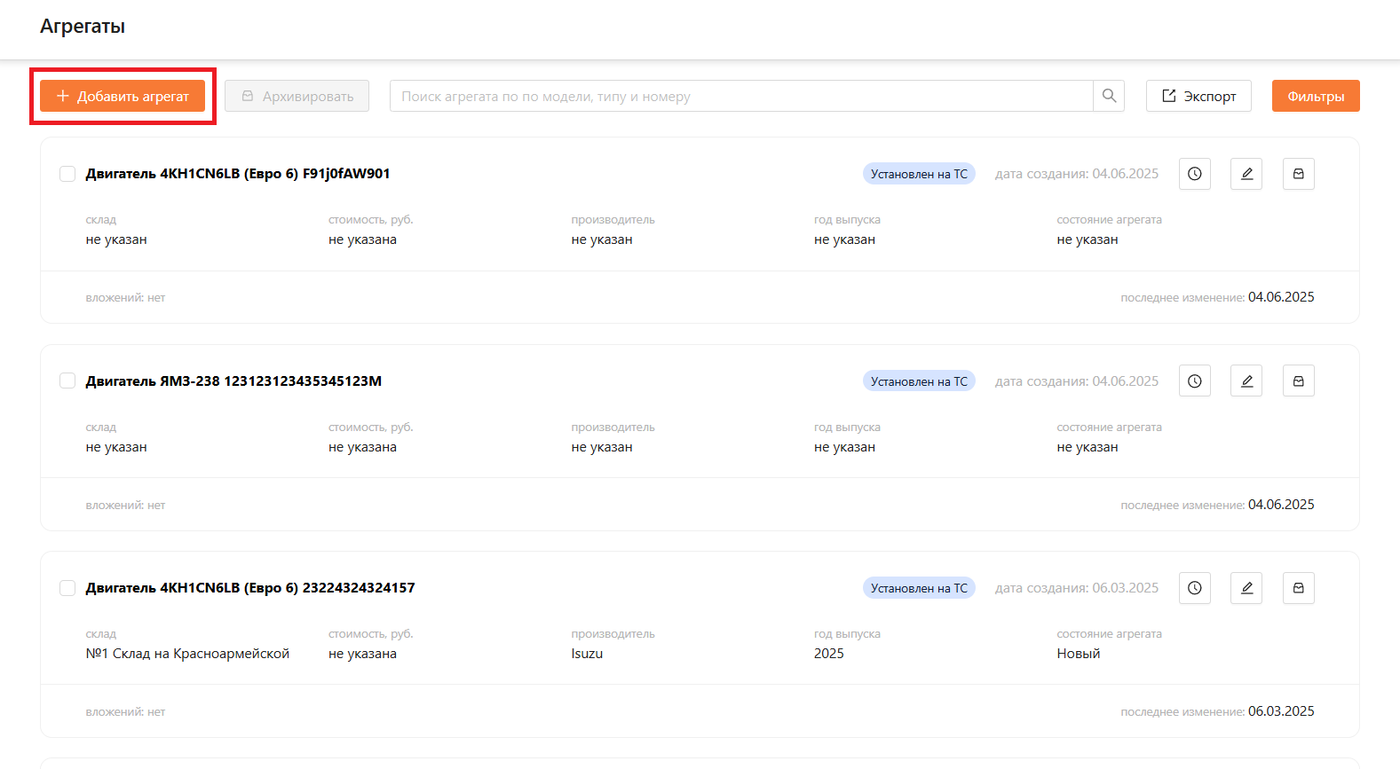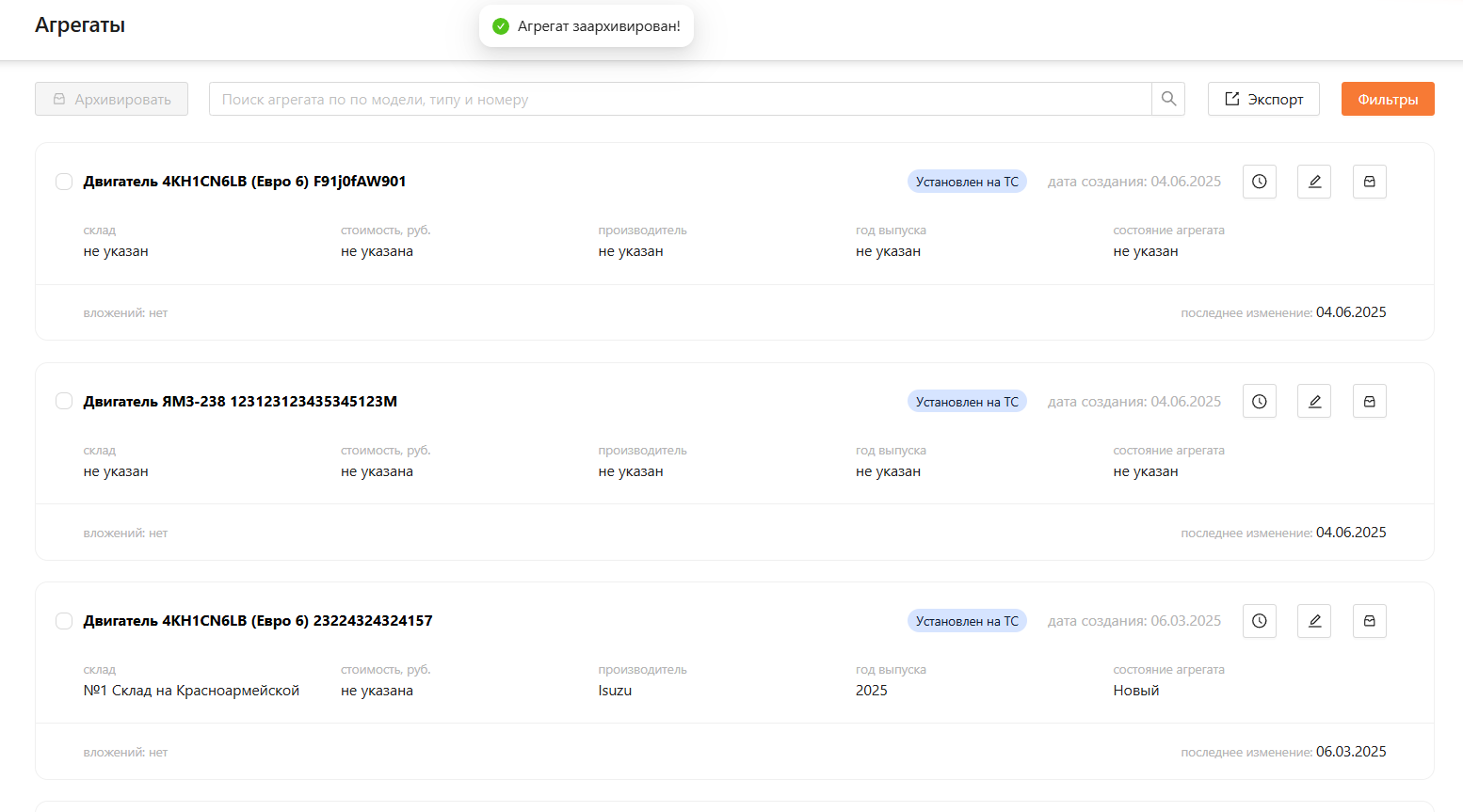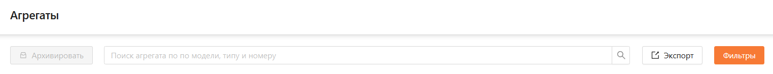 Архивировать: кнопка для массового архивирования выбранных агрегатов.