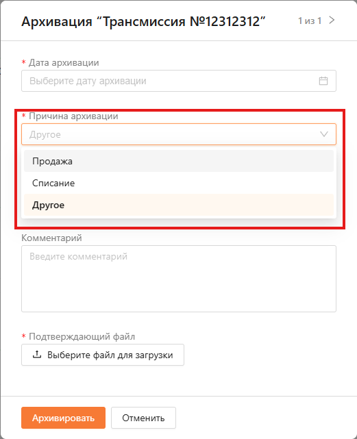 После нажатия на кнопку открывается окно архивирования. Необходимо указать дату архивирования, выбрать причину из списка или ввести свою, прикрепить подтверждающий файл и, при необходимости, добавить комментарий. В системе предусмотрены два стандартные причины архивирования, а также возможность указать собственную (см. рисунок 17).