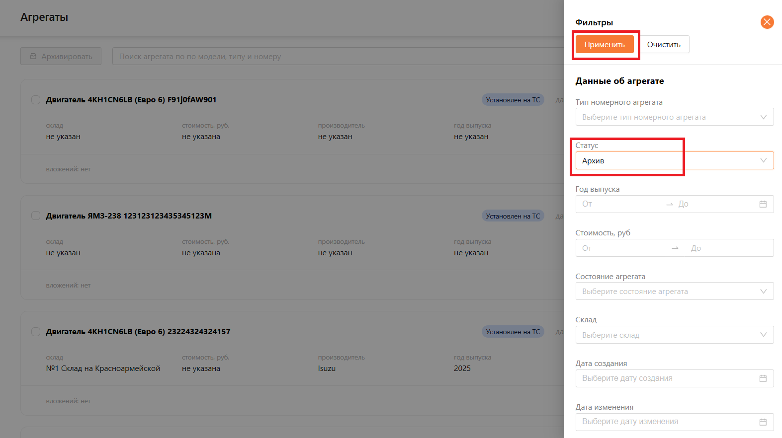 Для просмотра архивных агрегатов необходимо в фильтрах выбрать статус “Архив” и нажать на кнопку “Применить” (см. рисунок 20).