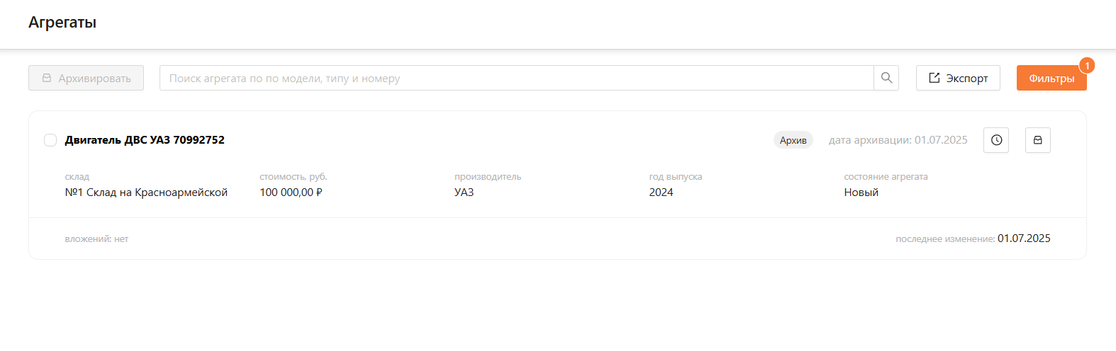 Для массового или одиночного архивирования необходимо выбрать агрегат и нажать на кнопку “Архивировать” либо нажать на кнопку справа (см. рисунок 16). Архивировать агрегат можно только со статусом “На складе”.