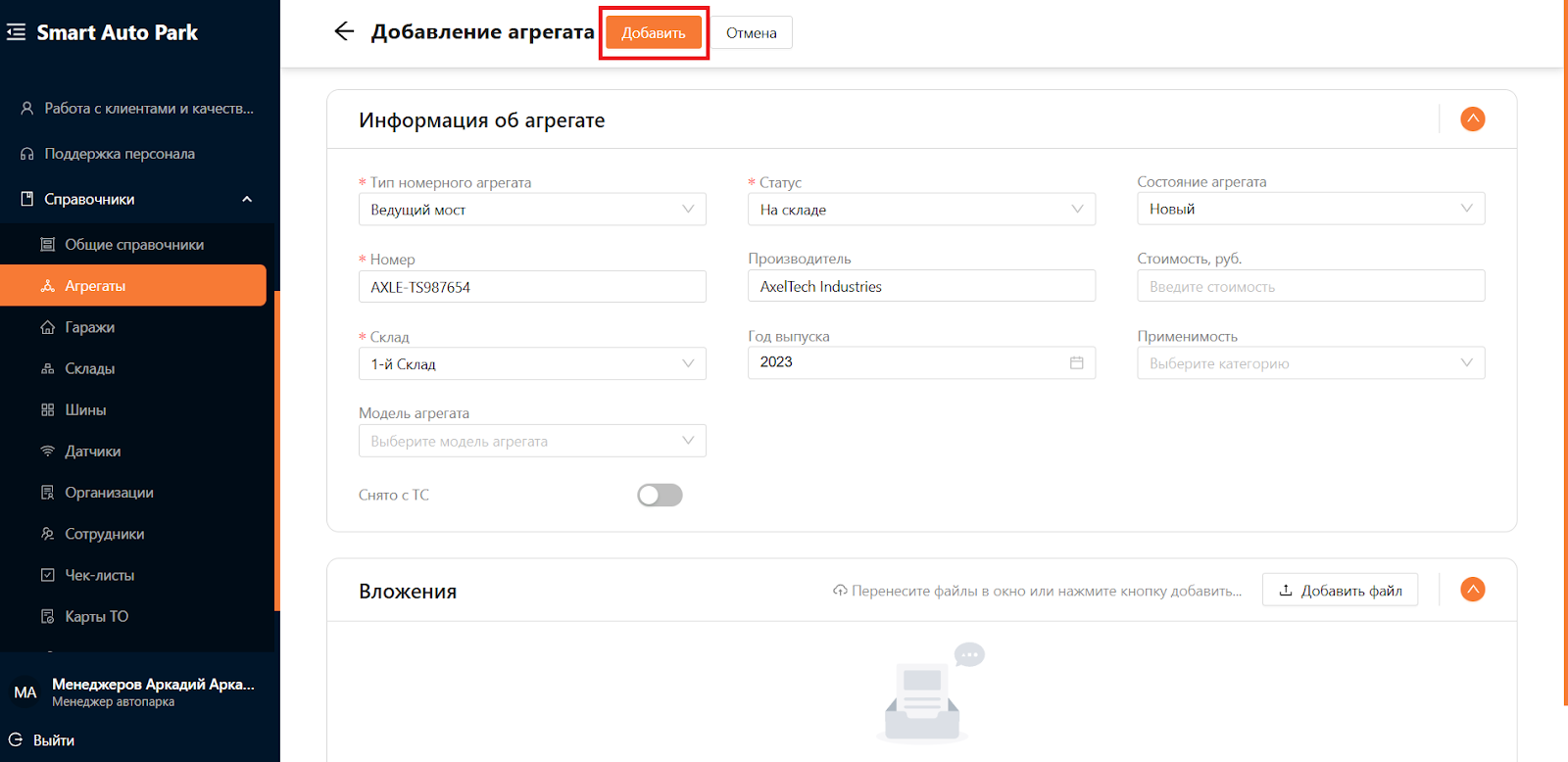 При добавлении нового агрегата обязательно заполните поля, отмеченные звездочкой; остальные поля можно заполнить по желанию. На рисунке 6 показан пример заполнения полей для агрегата. После завершения заполнения нажмите кнопку “Добавить”.
