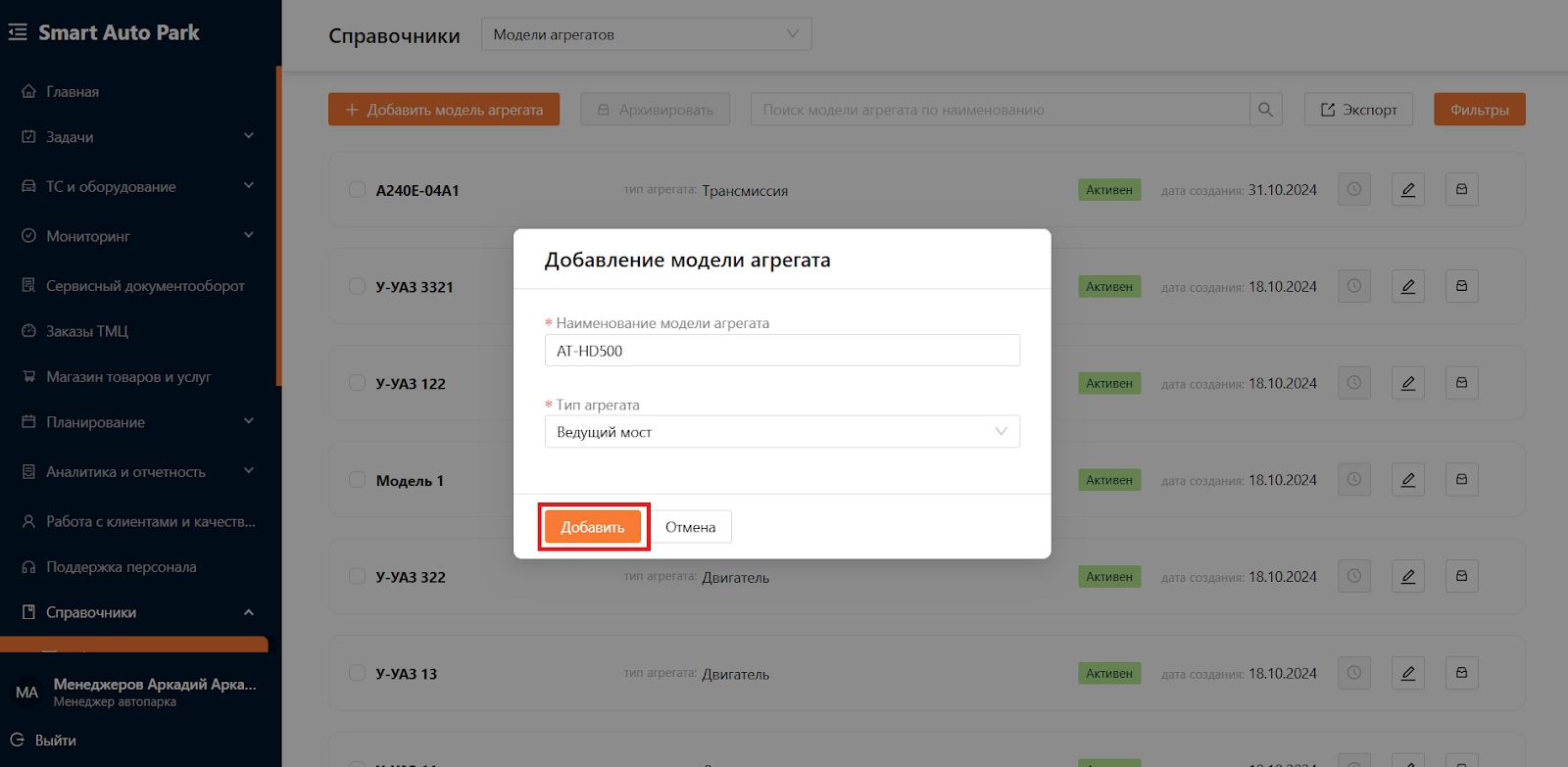 Для создания нового агрегата, нажмите на кнопку “Добавить агрегат” в левом верхнем углу веб-страницы, используя одну из следующих пользовательских ролей: “Администратор”, “Менеджер автопарка” или “Операционист” (см. рисунок 5).