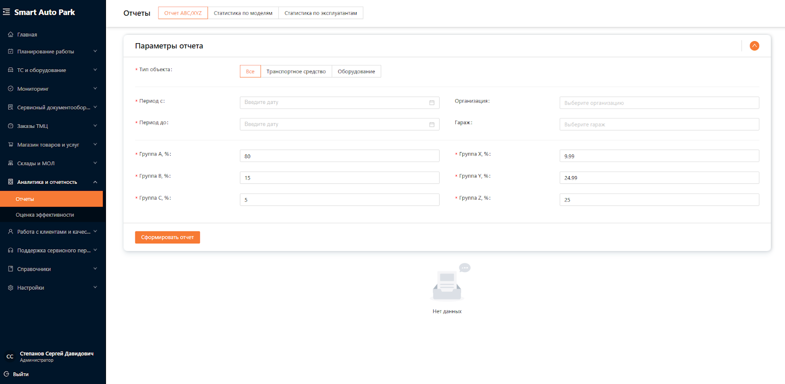 Система для управления автопарком предназначена для автоматизации и оптимизации всех аспектов эксплуатации и обслуживания транспортных средств и оборудования. Система является комплексным решением, охватывающим всю деятельность, связанную с управлением автопарка, от учета и мониторинга транспортных средств до планирования и аналитики. Одним из подразделов Системы является “Отчеты”.