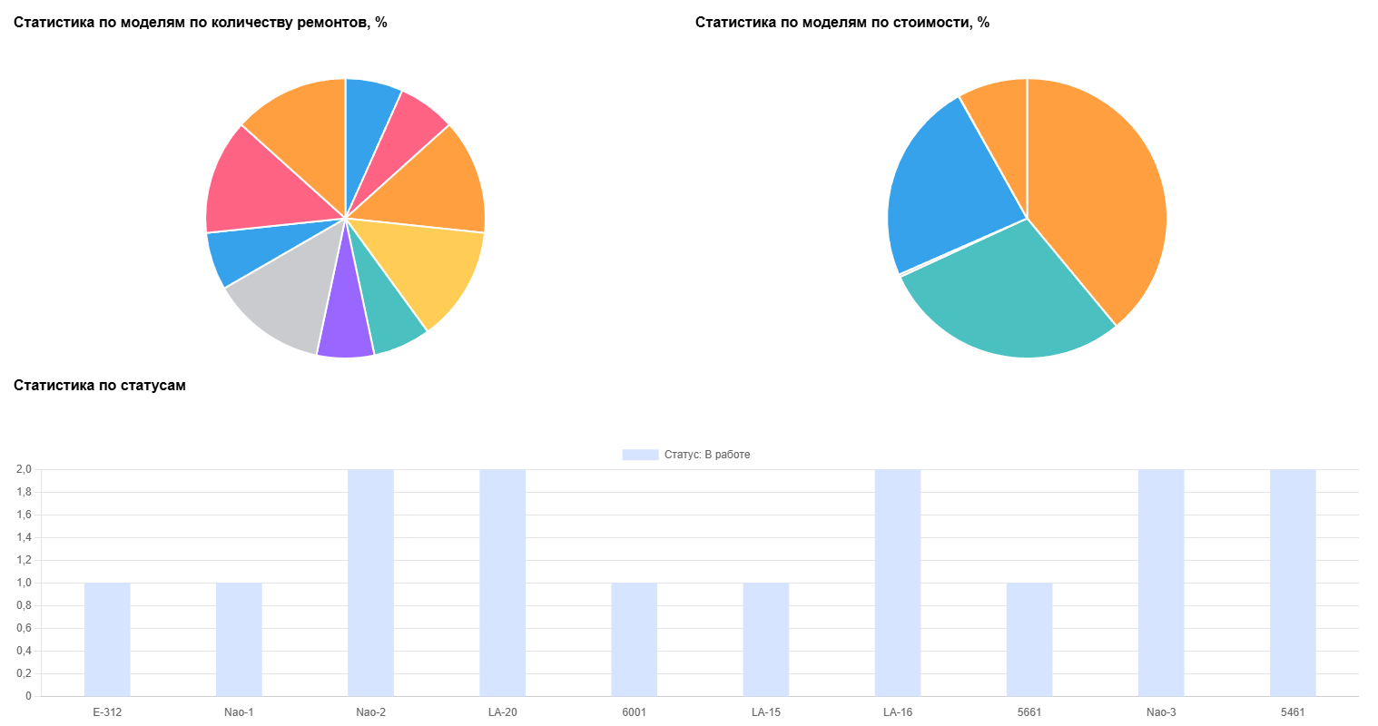 На рисунке 10 представлены графики: “Статистика по моделям по количеству ремонтов”, “Статистика по моделям по стоимости”, “Статистика по статусам” заказ-нарядов.