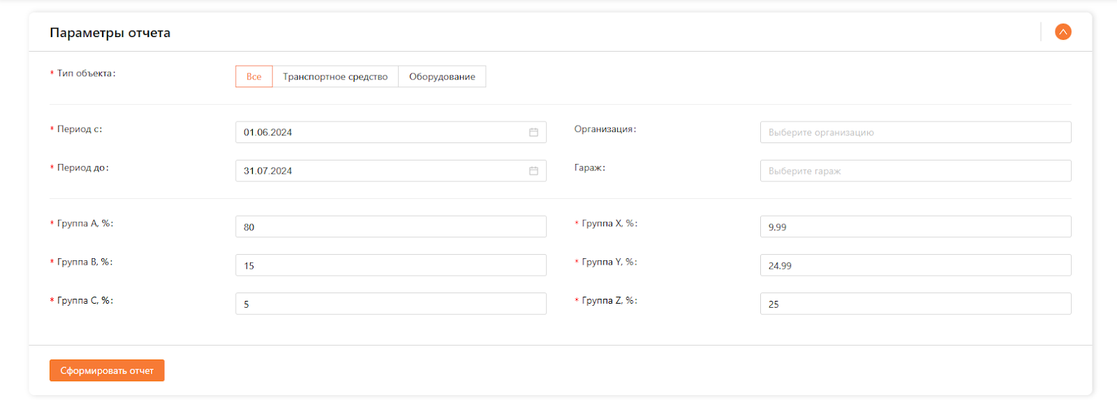 Тип объекта: укажите по какой технике конкретно выводить отчет ТС, оборудование либо отобразить все.