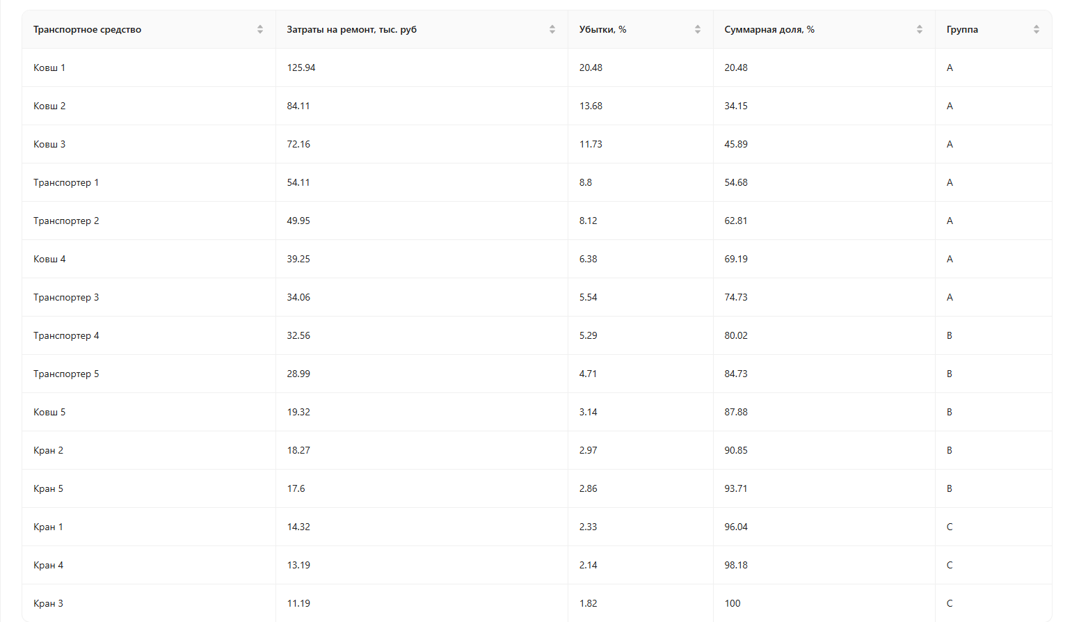 В первой таблице “ABC-анализ” (см. рисунок 3) определяются категории A, B, C на основе принципа Парето (80/20). Здесь ТС или оборудование классифицируются в зависимости от их вклада в общие затраты на ремонт. Она состоит из следующих столбцов: