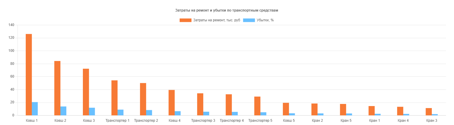 Отчеты позволяют анализировать затраты на ремонт, выявлять наиболее проблемные ТС или оборудования, а также оценивать работу эксплуатантов. Раздел предоставляет данные в виде таблиц и графиков.