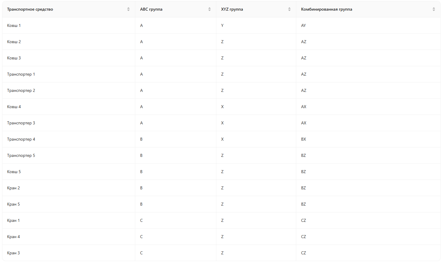 В третьей таблице “Классификация” проводится классификация объектов на основе ABC и XYZ-анализов, где каждая единица ТС или оборудования попадает в одну из девяти категорий (см. рисунок 6).