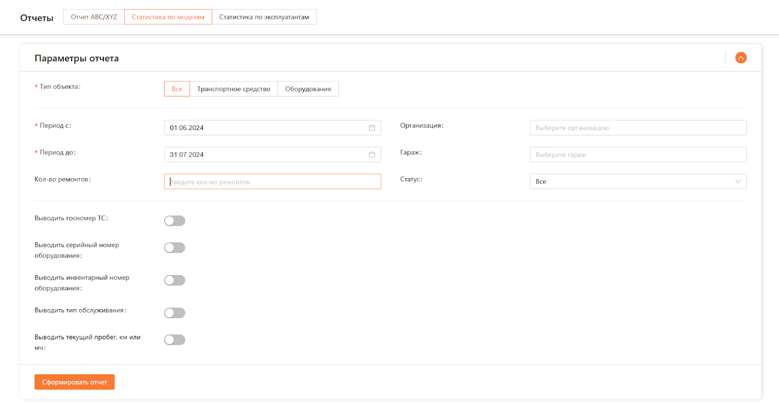 Отчет предназначен для детального анализа состояния и обслуживания техники и оборудования по различным моделям. В отчете собирается информация о количестве объектов каждой модели, проведенных типах обслуживания, времени нахождения на ремонте, текущем пробеге, и стоимости выполненных работ. Это позволяет оценить производительность и надежность разных моделей, выявить проблемные участки и планировать дальнейшее обслуживание. Отчет состоит из таблицы и 3-х графиков. Для того чтобы сформировать отчет необходимо указать параметры отчета (см. рисунок 8).