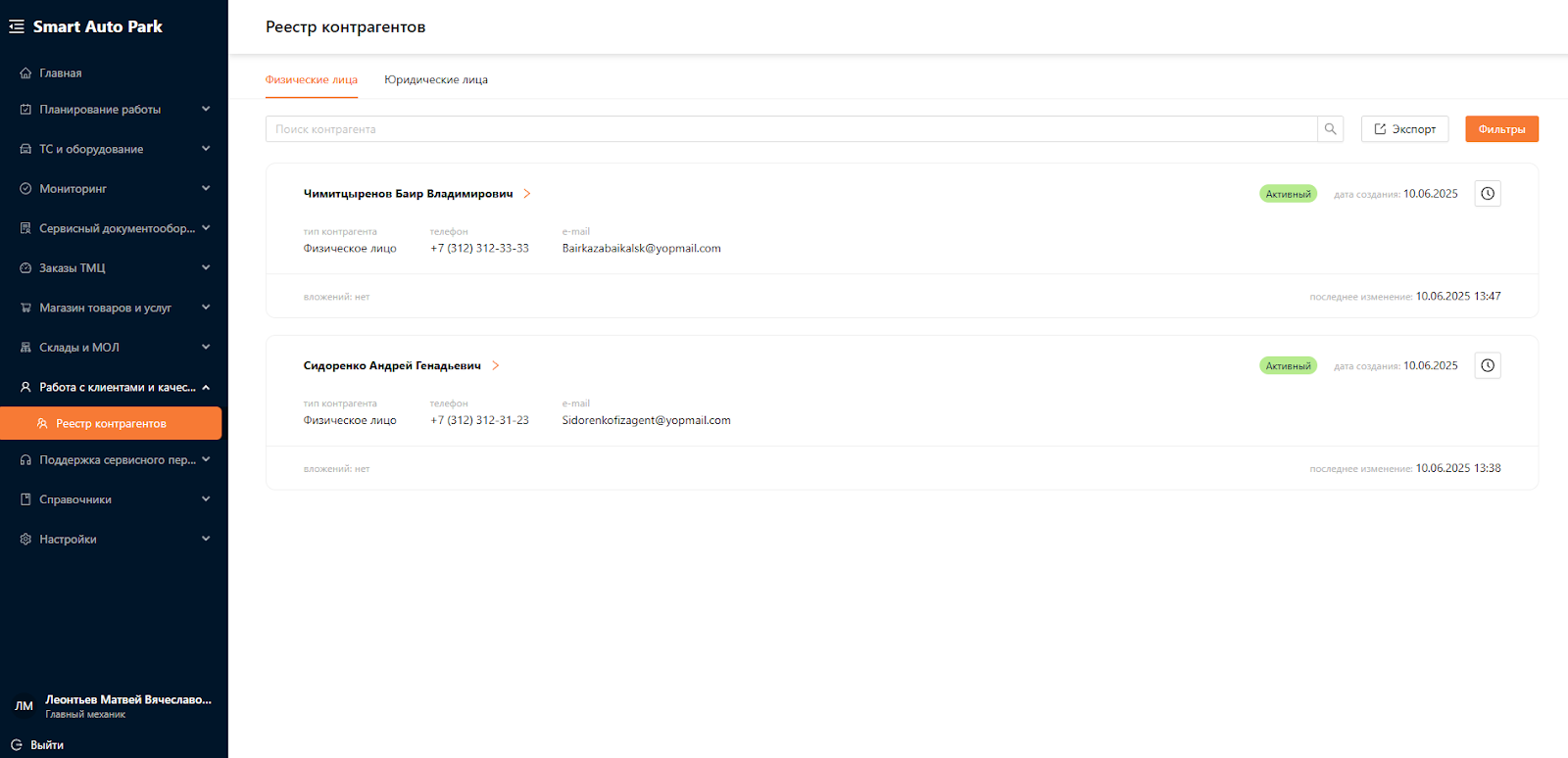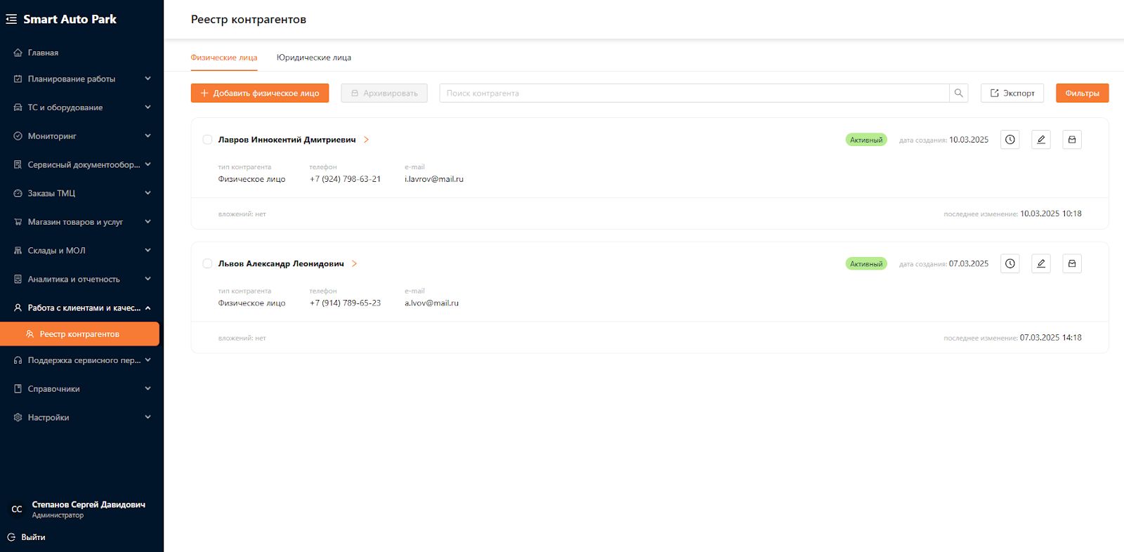 В выбранной подсистеме у пользователей с ролью “Администратор”, “Менеджер автопарка” или “Операционист” есть доступ к кнопкам “Добавить физическое лицо”, “Добавить юридическое лицо”, “Архивировать”, “Экспорт” и “Фильтры” (см. рисунок 3 и 4).