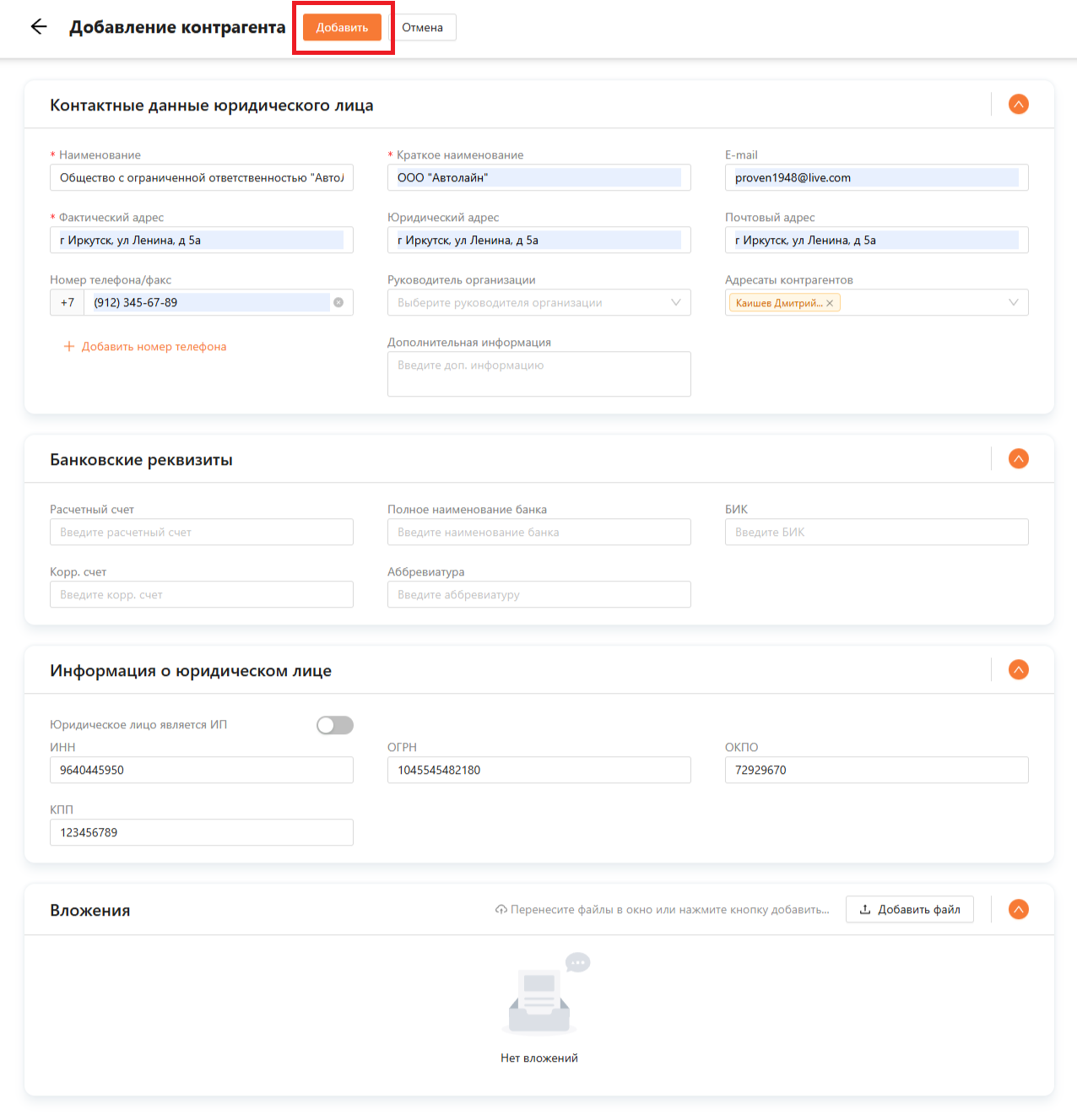 При добавлении нового юридического лица обязательно заполните поля, отмеченные звездочкой; остальные поля можно заполнить по желанию. На рисунке 10 показан пример заполнения полей для юридического лица. После завершения заполнения нажмите кнопку “Добавить”.