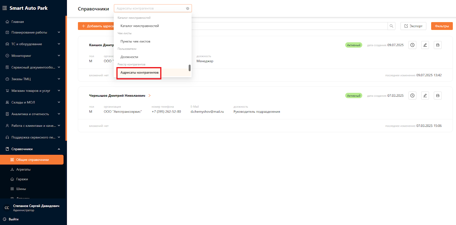 Система для управления автопарком предназначена для автоматизации и оптимизации всех аспектов эксплуатации и обслуживания транспортных средств и оборудования. Система является комплексным решением, охватывающим всю деятельность, связанную с управлением автопарка, от учета и мониторинга транспортных средств до планирования и аналитики. Одним из подразделов Системы является “Реестр контрагентов”.