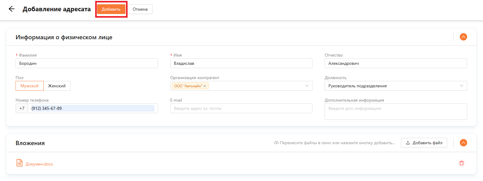 Заполняем обязательные поля в модели адресата и нажимаем на кнопку “Добавить” (см. рисунок 14).