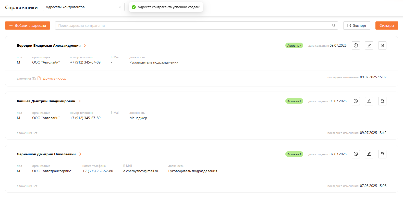 Для добавления нового адресата, нажмите на кнопку “Добавить адресата” в левом верхнем углу веб-страницы (см. рисунок 13).