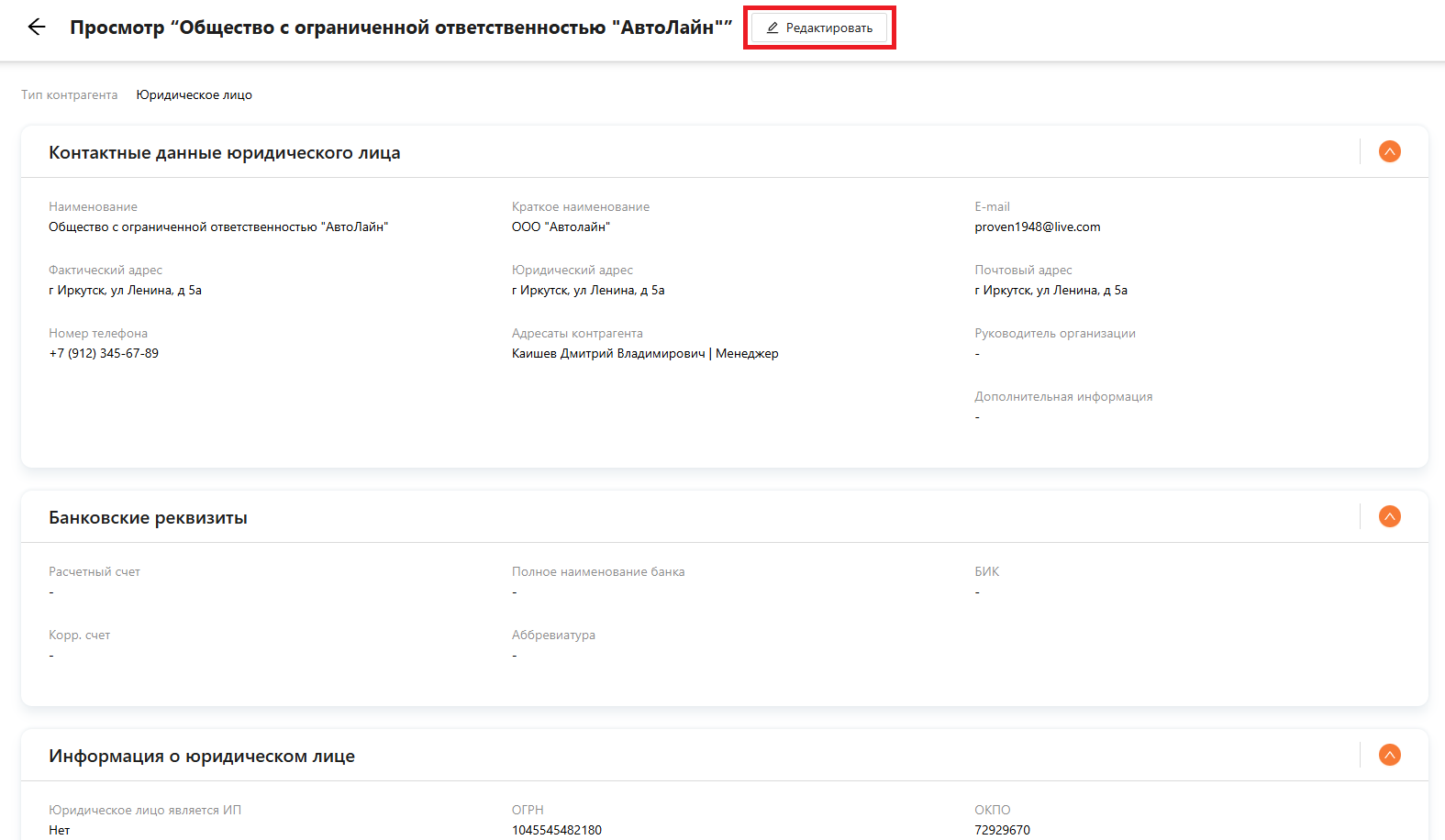 Для дозаполнения контрагента выбираем ранее созданный и нажимаем на кнопку редактировать (см. рисунок 16).