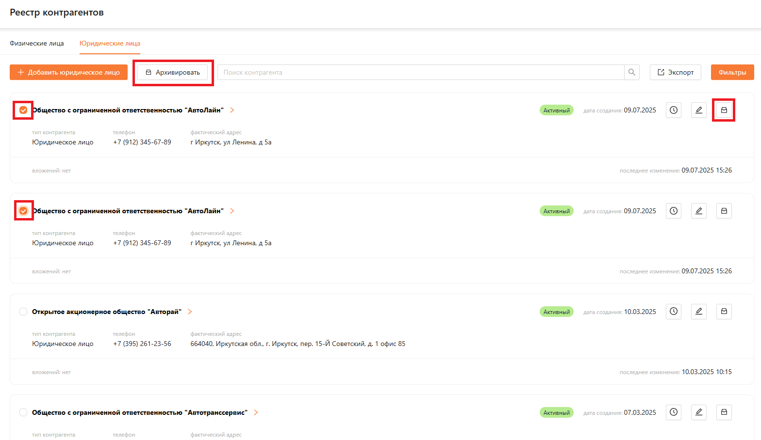Архивировать: кнопка для массового архивирования выбранных контрагентов.