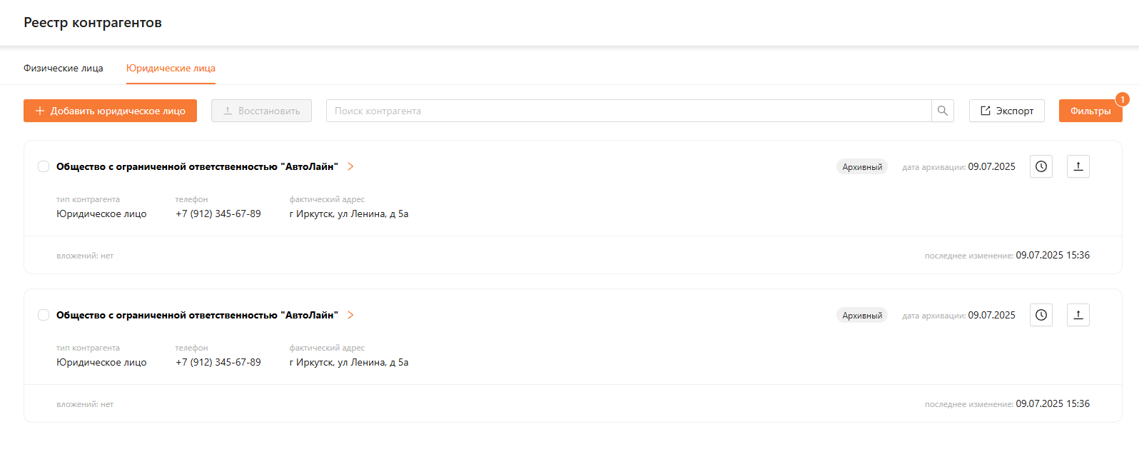 После применения фильтра в общем списке отобразятся только те контрагенты, которые находятся в статусе “Архив” (см. рисунок 21).