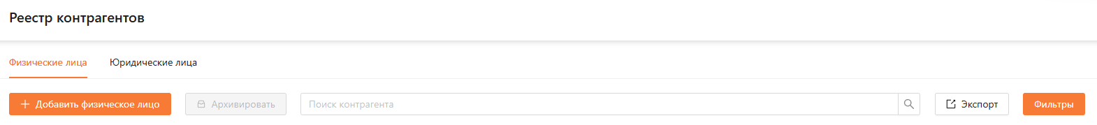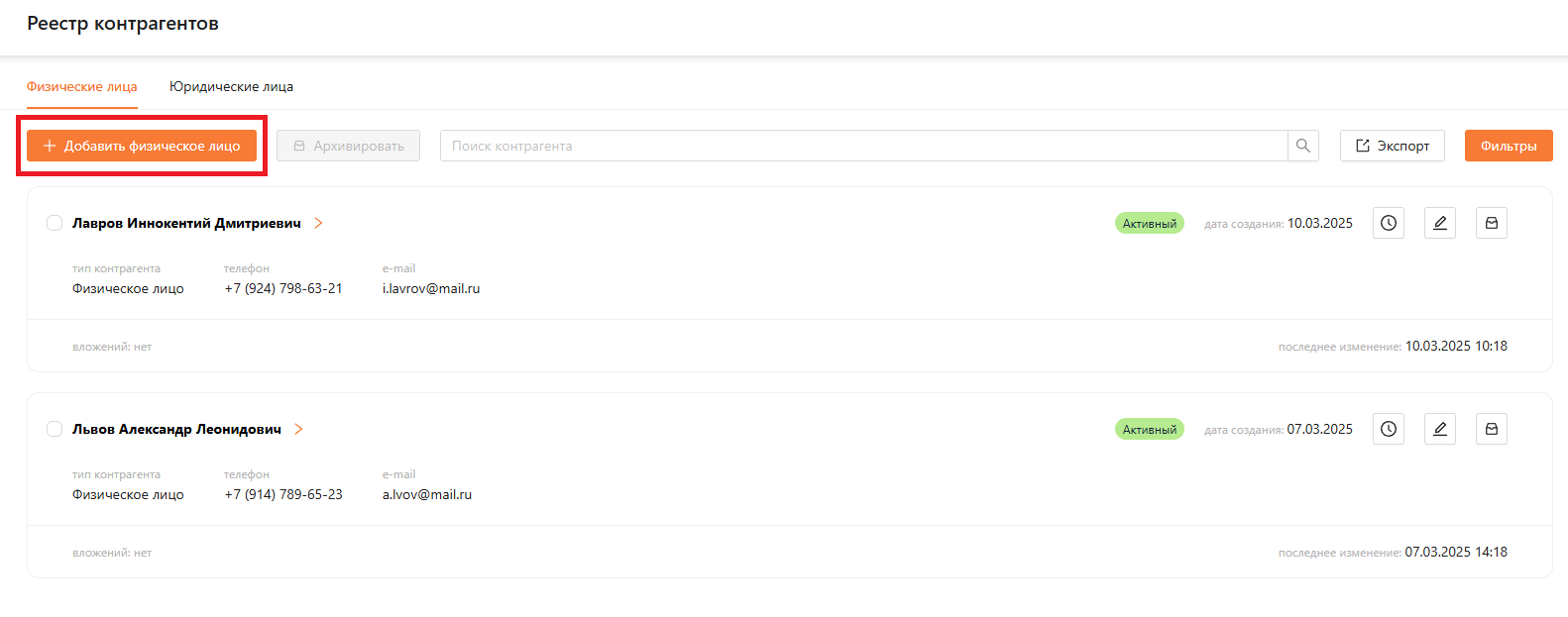 Добавить физическое лицо: кнопка для добавления нового контрагента (физическое лицо).