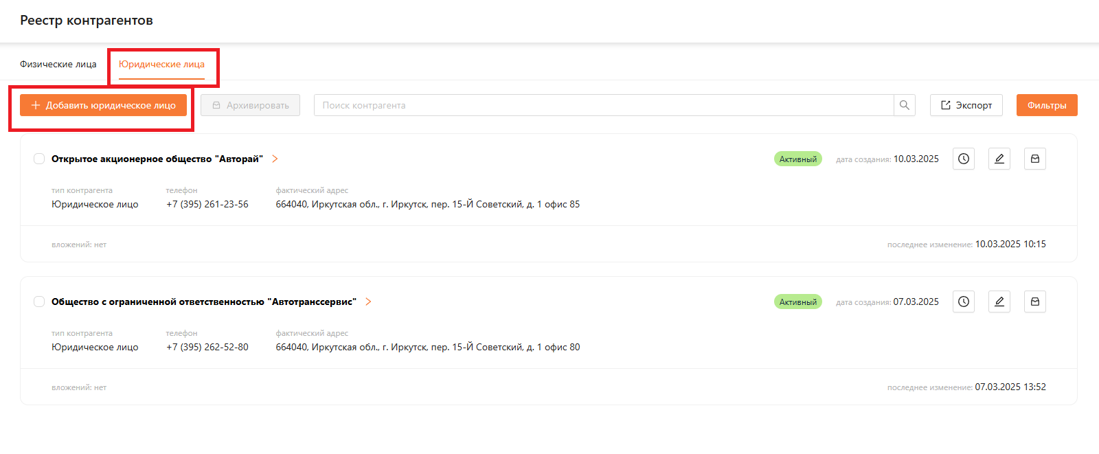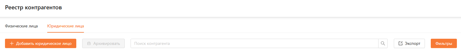 Добавить юридическое лицо: кнопка для добавления нового контрагента (юридическое лицо).