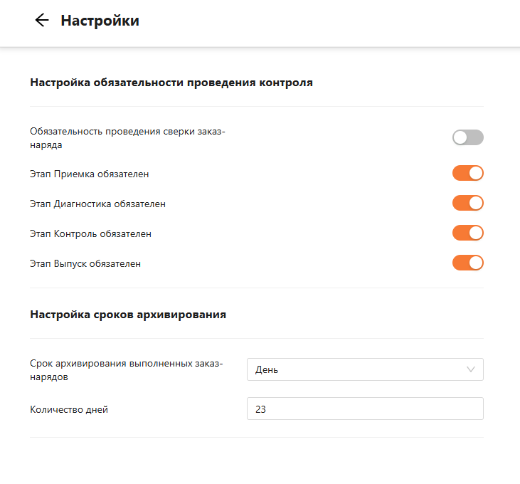 Для работы с заказ-нарядами выберите раздел “Сервисный документооборот” подраздел “Заказ-наряды”. Для подраздела предусмотрены дополнительные настройки, представленные на рисунке 1. Можно настроить обязательность проведения сверки заказ-наряда (запчастей и работ) операционистом, обязательность проведения этапов: приемка, диагностика, контроль, выпуск, а также можно настроить автоматическое архивирование выполненных заказ-нарядов и указать количество дней.