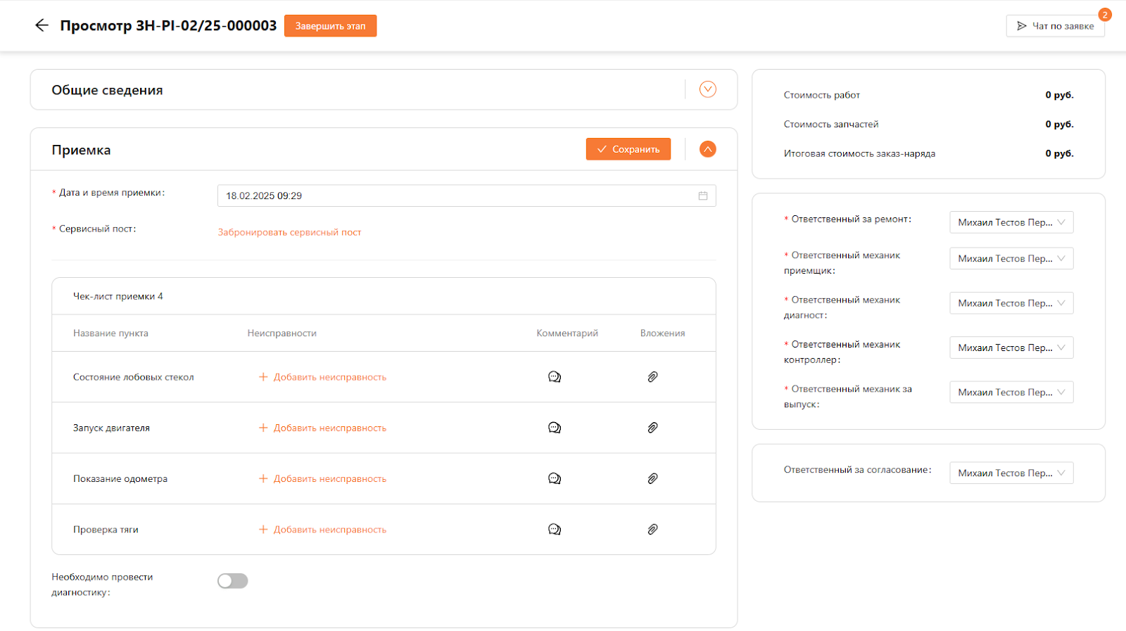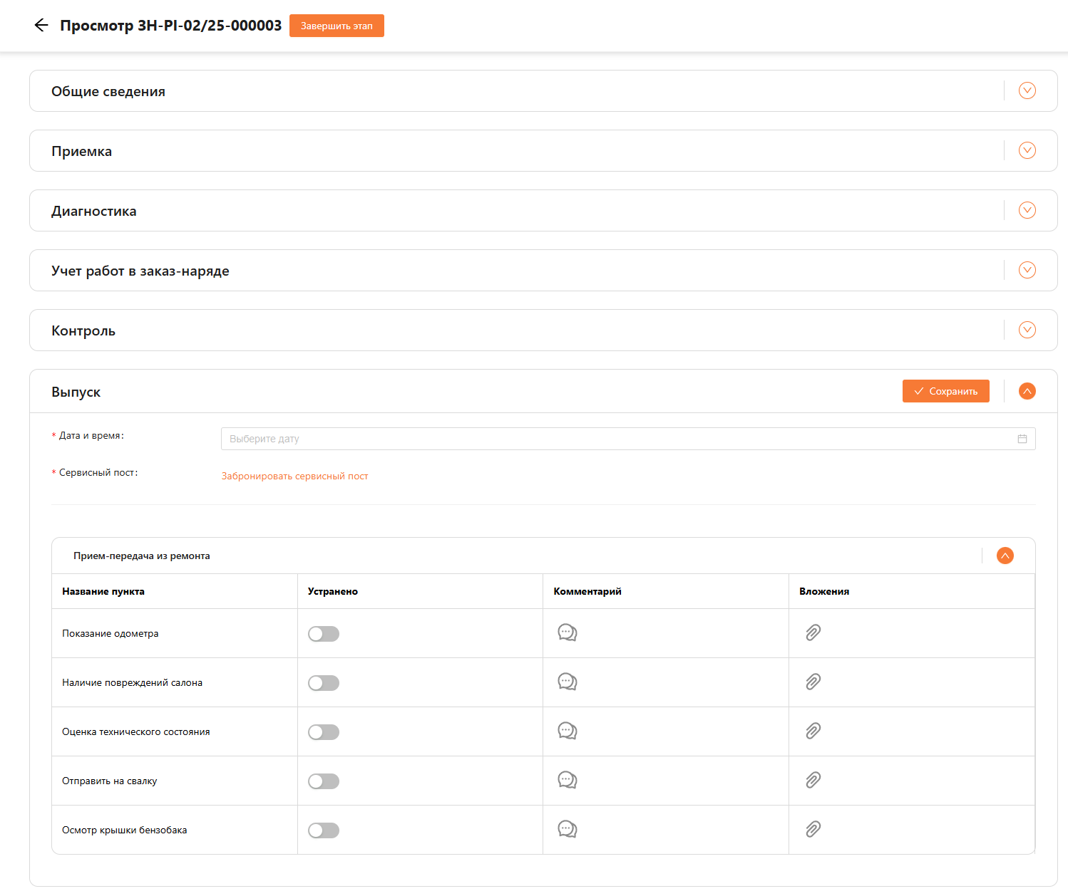 Для каждой работы необходимо бронировать сервисный пост отдельно. В чек-листе можно указать устранена проблема или нет по каждому пункту, а также комментарий и вложение.