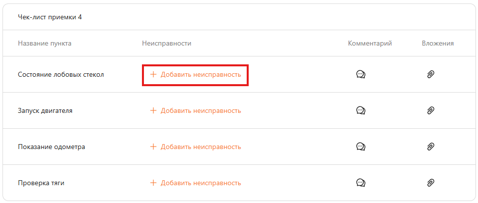 На один пункт чек-листа можно указать несколько неисправностей. Если неисправности отсутствуют, то они не добавляются. Также по каждому пункту чек-листа можно оставить комментарий и приложить вложения.