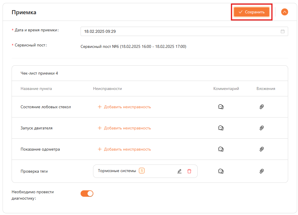 - чек-лист приемки подтягивается автоматически, в нем по каждому пункту можно указать неисправности из каталога неисправностей;