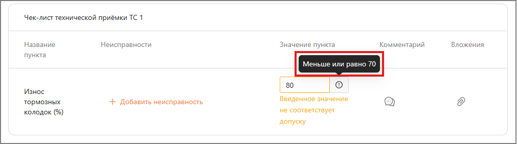 Если в чек-листе предусмотрены пункты с допусками, пользователю необходимо учитывать допустимые значения, заданные заранее в справочнике допусков. Такие пункты визуально выделяются специальной иконкой. При наведении на нее появляется всплывающая подсказка с описанием допустимого диапазона или условия (см. рисунок 16).