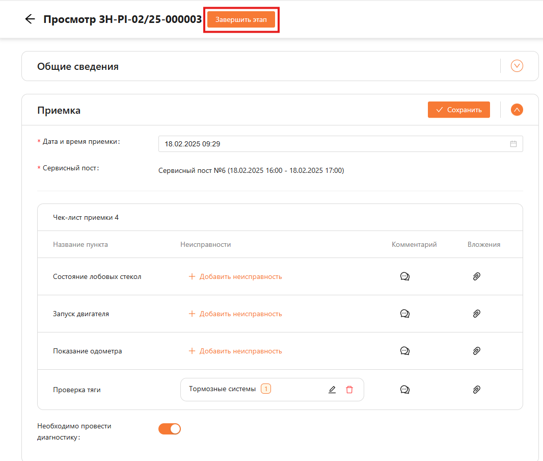 - необходимость проведения диагностики. Чекбокс выводится, если этап “Приемка” в настройках обязателен. Если кликнуть в положение “Да”, то следующий этап “Диагностика” будет пропущен.