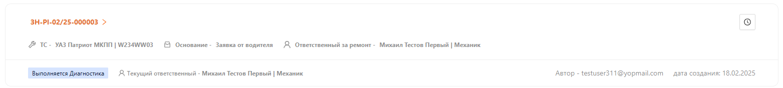 Для выполнения этапа “Диагностика” необходимо зайти под пользователем, который был указан ответственным за диагностику на предыдущем этапе, и открыть заказ-наряд (см. рисунок 20).