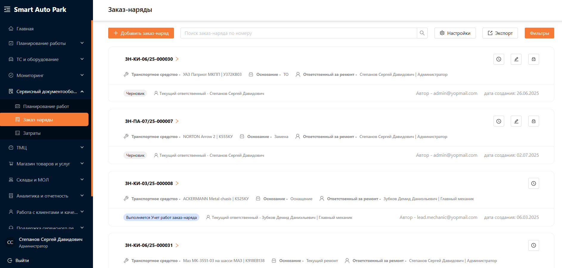 В выбранной подсистеме у пользователей с ролью “Администратор”, “Менеджер автопарка”, “Операционист”, “Главный механик” и “Механик” есть доступ к кнопкам “Добавить заказ-наряд”, “Настройки”, “Экспорт” и “Фильтры” (см. рисунок 3).