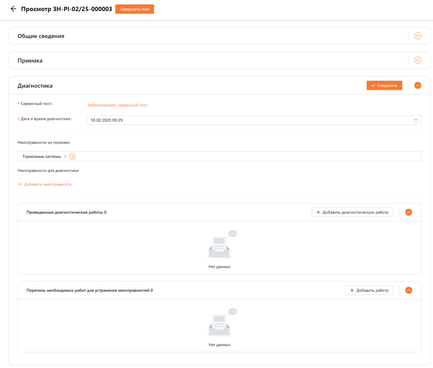 Для каждой работы необходимо бронировать сервисный пост отдельно. Для перехода на следующий шаг нужно нажать на кнопку “Завершить этап”.