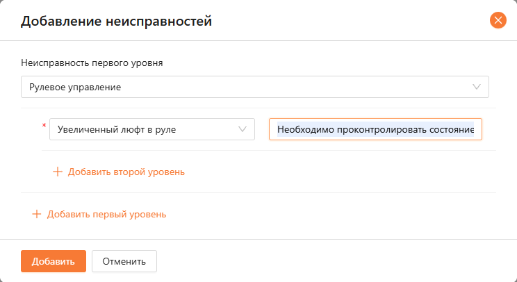 Неисправности выбираются из каталога неисправностей (1 и 2 уровень). В открывшемся модальном окне нужно заполнить: