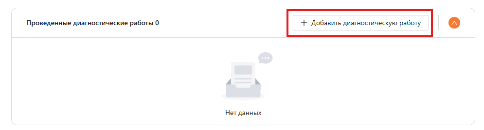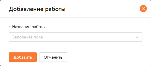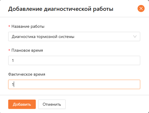 При нажатии на кнопку “Добавить диагностическую работу” (см. рисунок 23) открывается модальное окно (см. рисунок 24), где нужно выбрать название работы и ввести плановое и фактическое время работ.