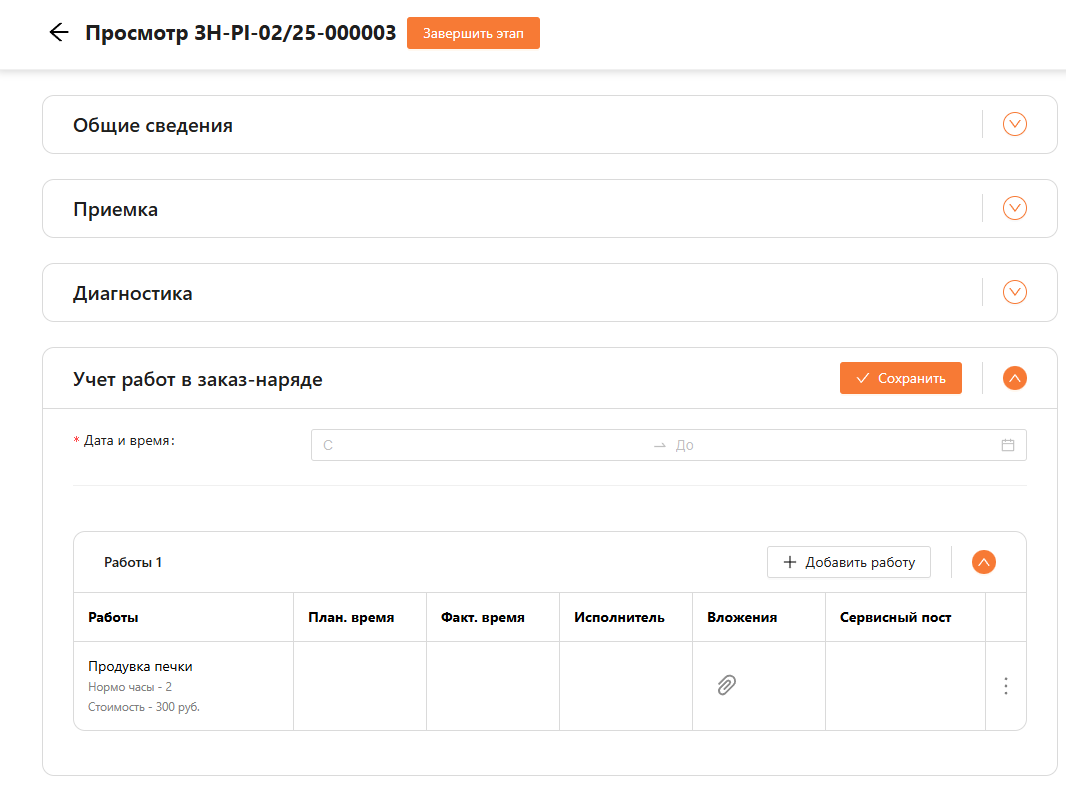 Для перехода на следующий шаг нужно нажать на кнопку “Завершить этап”. Статус у заказ-наряда изменится на “Выполняется учет работ заказ-наряда” и ответственный может приступить к выполнению следующего этапа (см. рисунок 27).