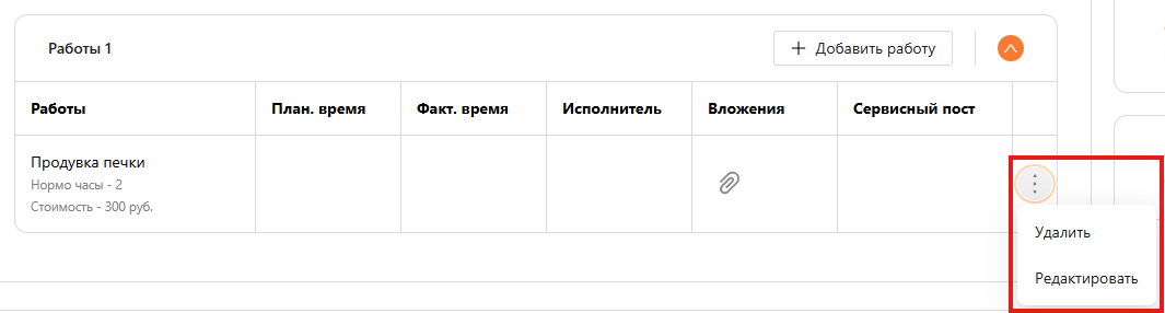 Работы, которые были указаны на этапе диагностики, отображаются в таблице работ на этапе учета работ заказ-наряда. Их можно удалить или отредактировать (см. рисунок 29).