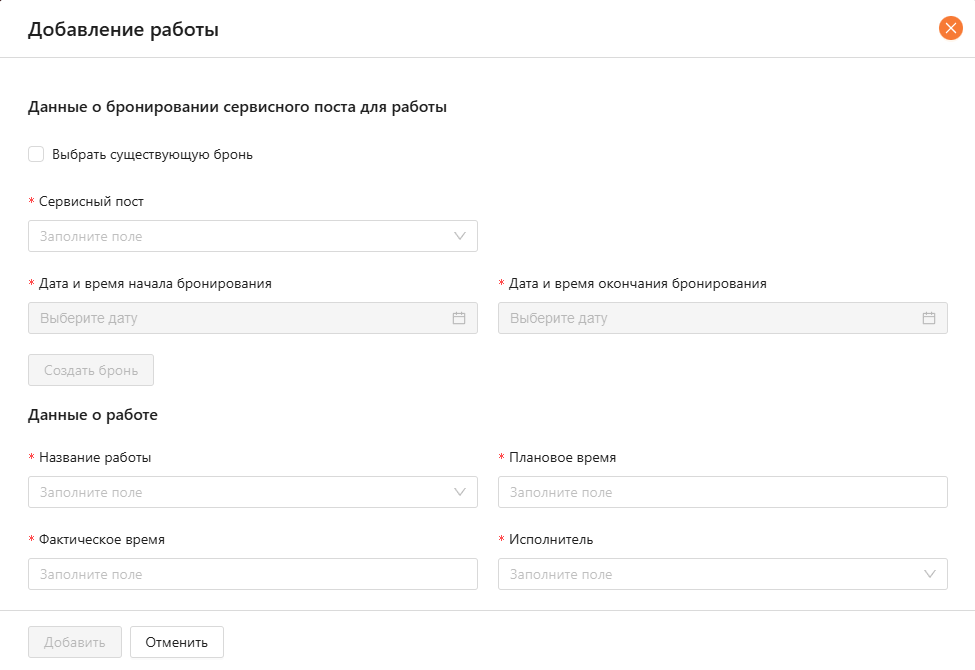 В открывшемся модальном окне (см. рисунок 31) необходимо забронировать сервисный пост и указать данные по работе: название работы, плановое время, фактическое время и исполнитель.
