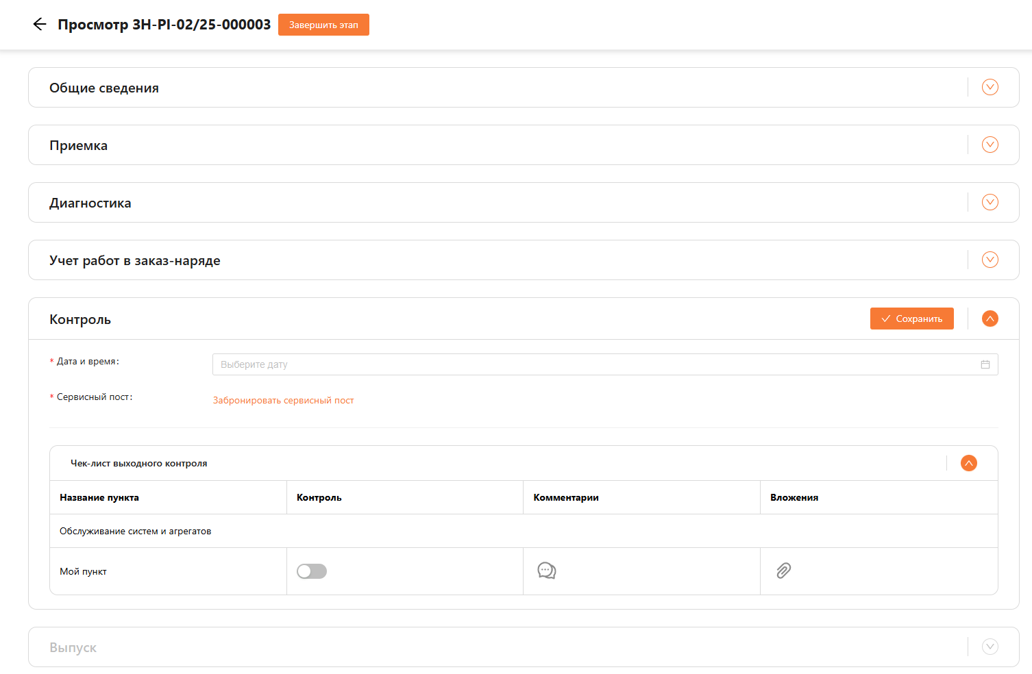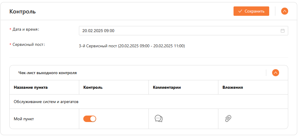 Для каждой работы необходимо бронировать сервисный пост отдельно. Чек-лист выходного контроля формируется из указанных типов работ на этапе “Учет работ заказ-наряда”. Для каждого типа работ формируется свой чек-лист. В нем можно указать прошел ли ТС проверку по пункту, комментарий и вложение (см. рисунок 34).