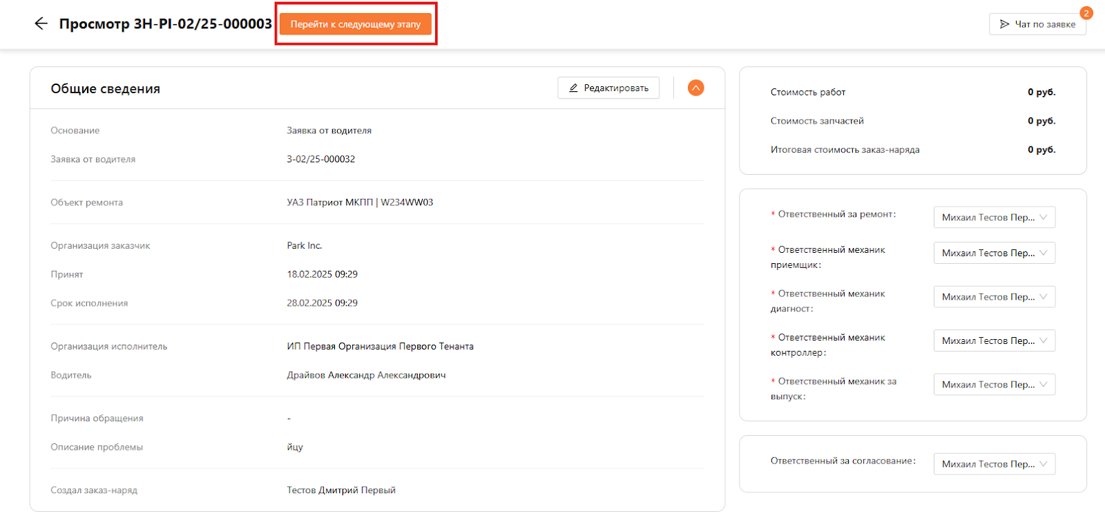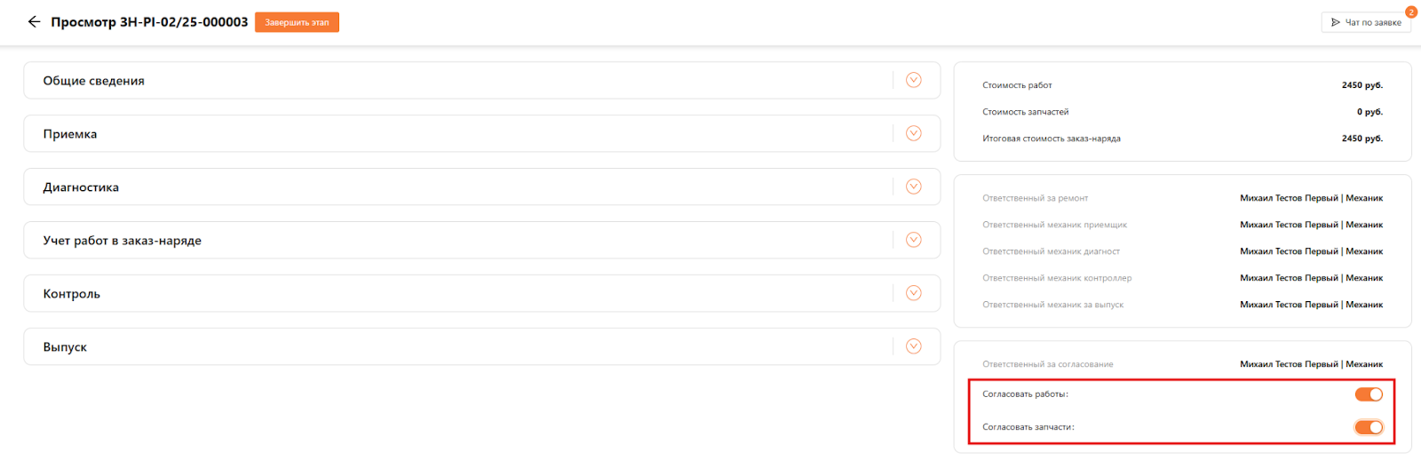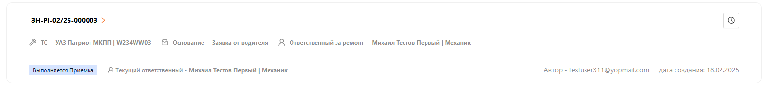 Статус у заказ-наряда изменится на “Выполняется приемка” и ответственный может приступить к выполнению следующего этапа (см. рисунок 9).
