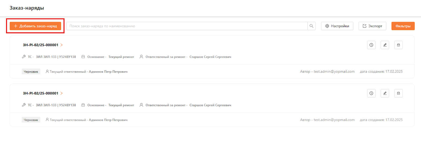 Добавить заказ-наряд: кнопка для добавления нового заказ-наряда.