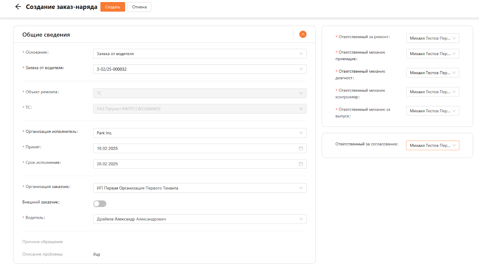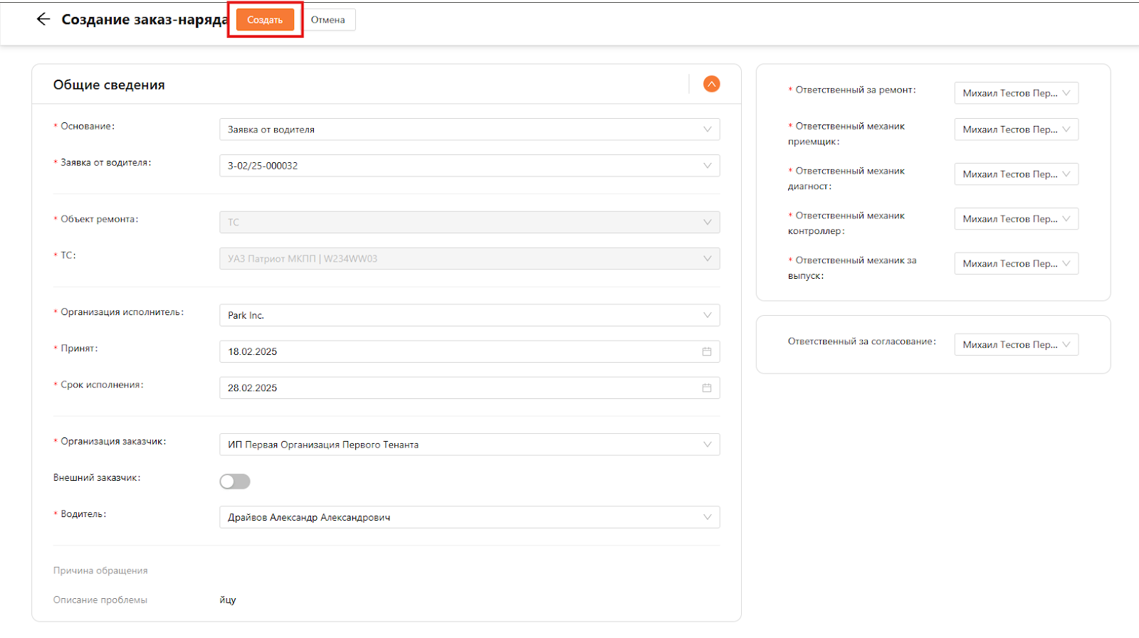 Далее нужно нажать на кнопку “Создать” (см. рисунок 6), после чего заказ-наряд будет сохранен со статусом “Черновик”.