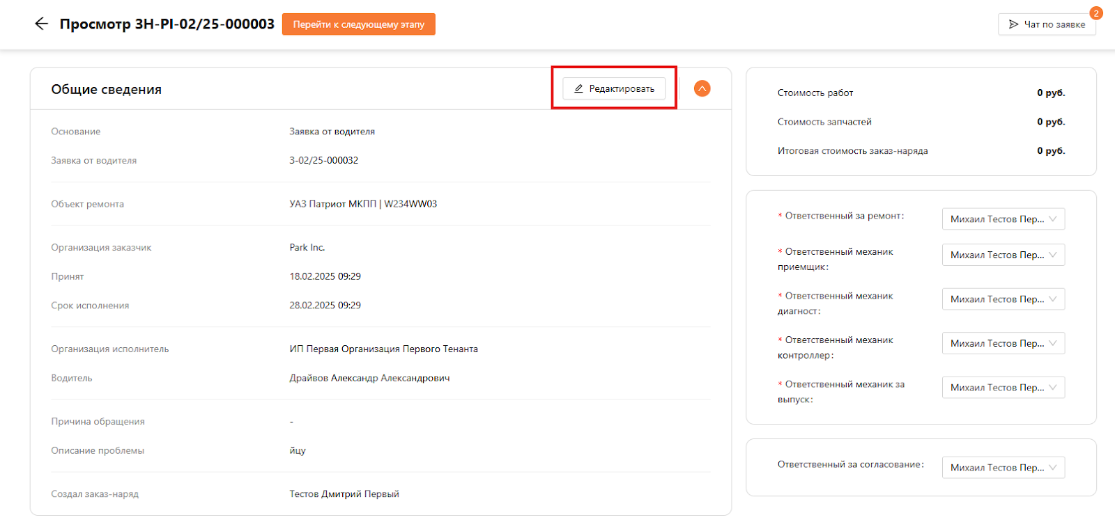 Общие сведения в заказ-наряде со статусом “Черновик” можно изменить, нажав на кнопку “Редактировать” (см. рисунок 7).