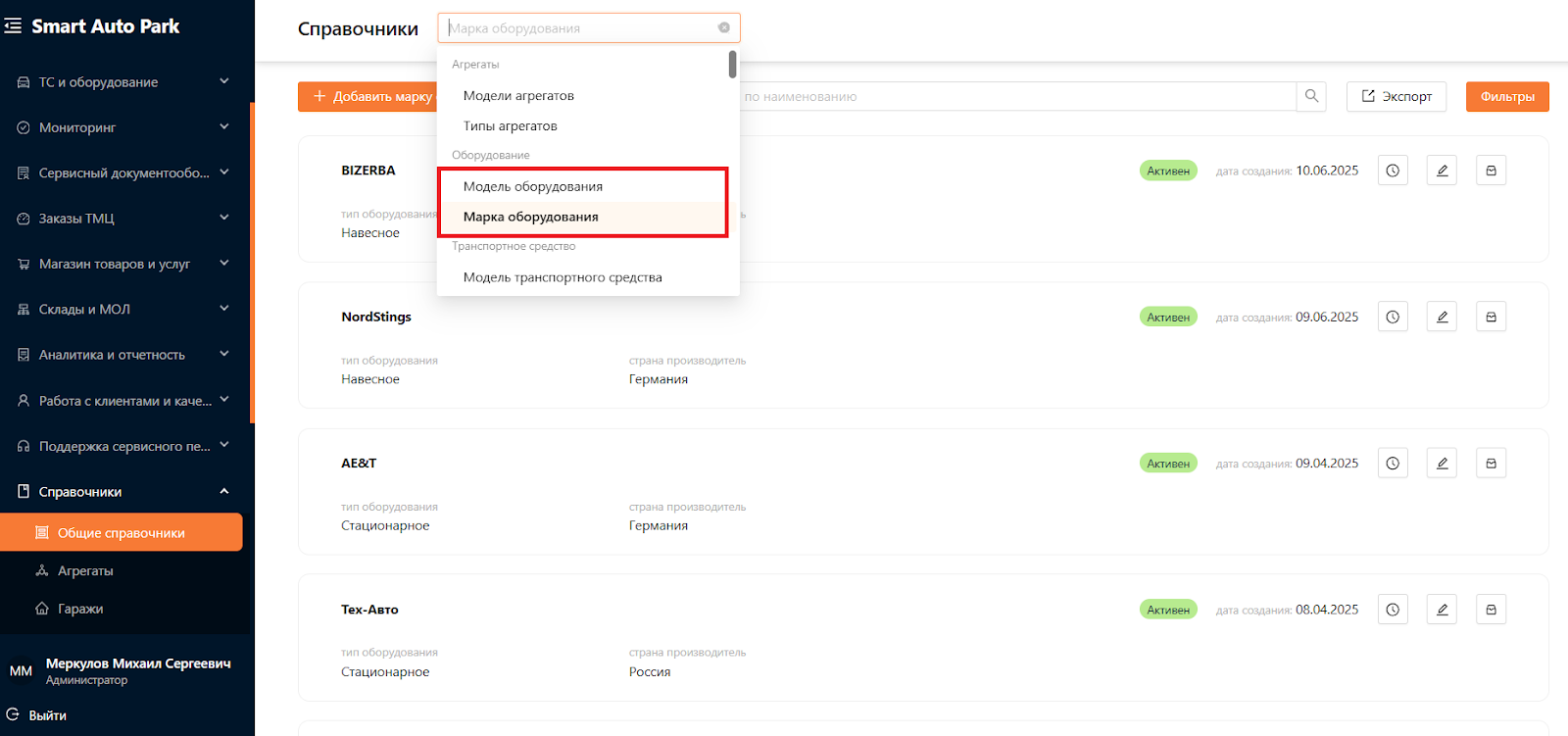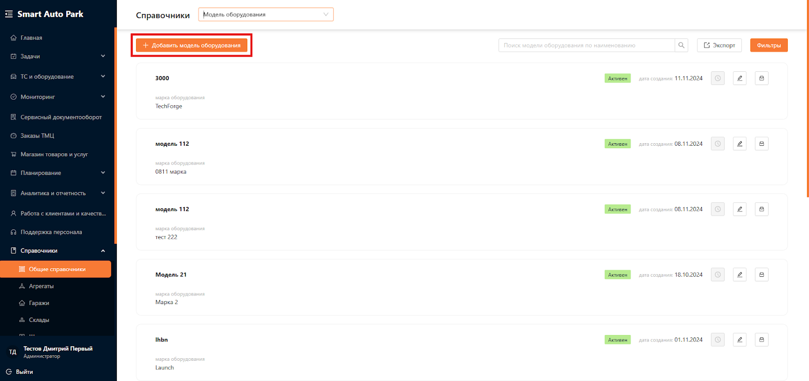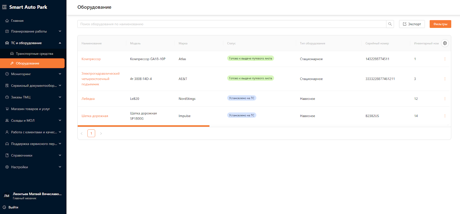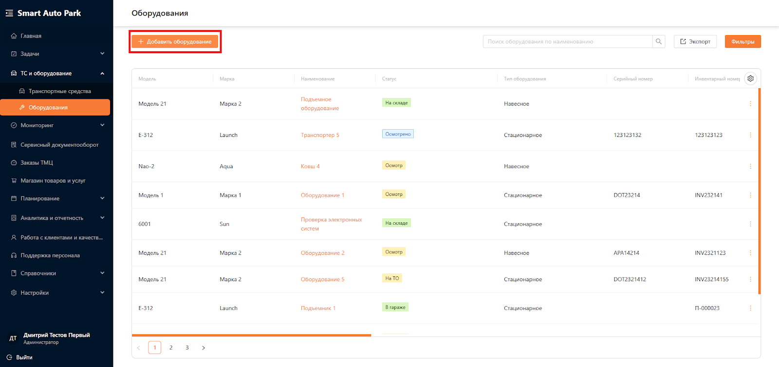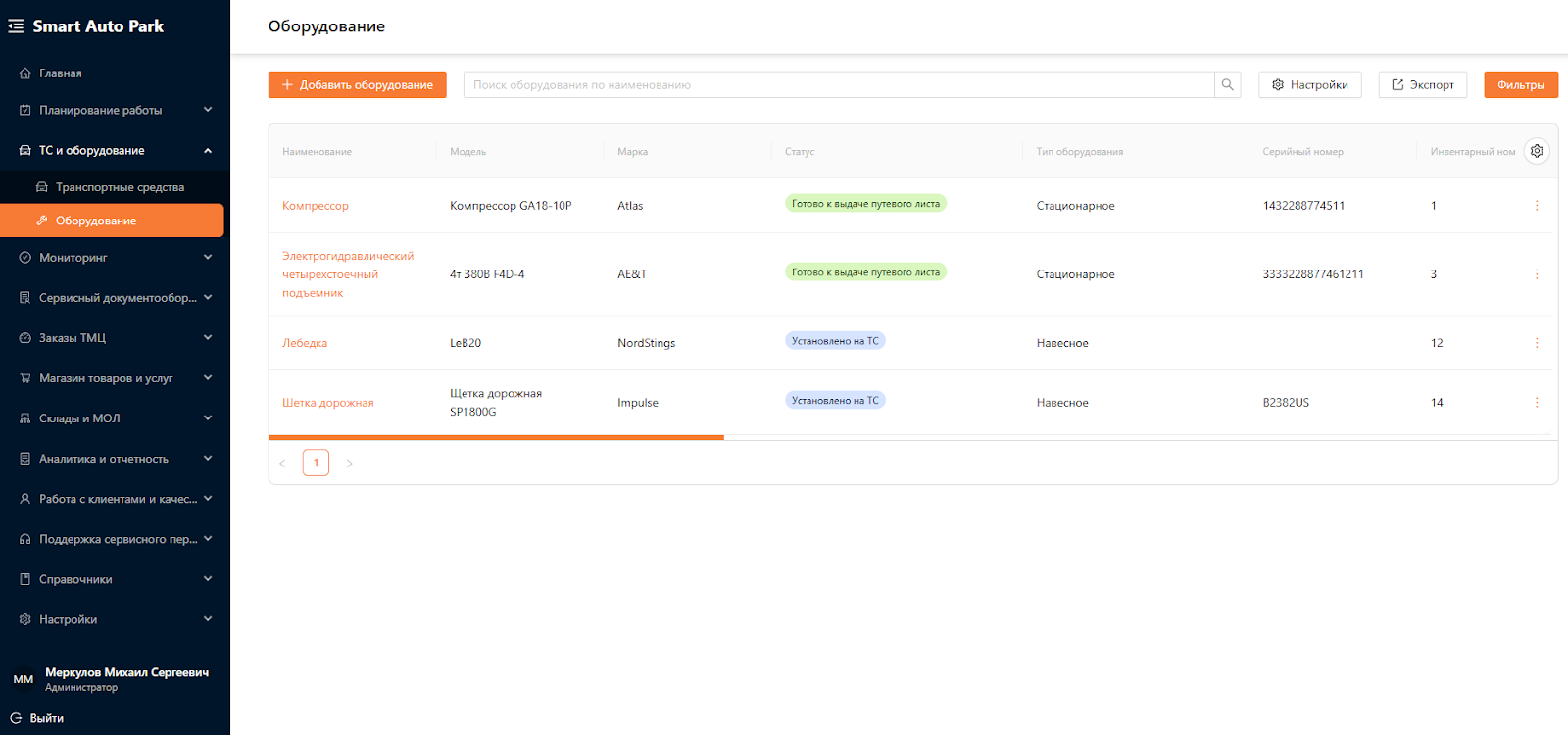 Система для управления автопарком предназначена для автоматизации и оптимизации всех аспектов эксплуатации и обслуживания транспортных средств и оборудования. Система является комплексным решением, охватывающим всю деятельность, связанную с управлением автопарка, от учета и мониторинга транспортных средств до планирования и аналитики. Одним из подразделов Системы является “Оборудование”.