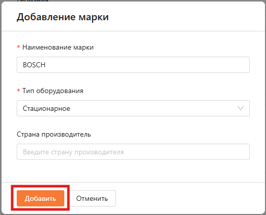 При добавлении новой марки оборудования заполните поле “Наименование марки”, выберите тип оборудования и при желании укажите страну-производителя. На рисунке 11 показан пример заполнения марки оборудования. После завершения заполнения нажмите кнопку “Добавить”.