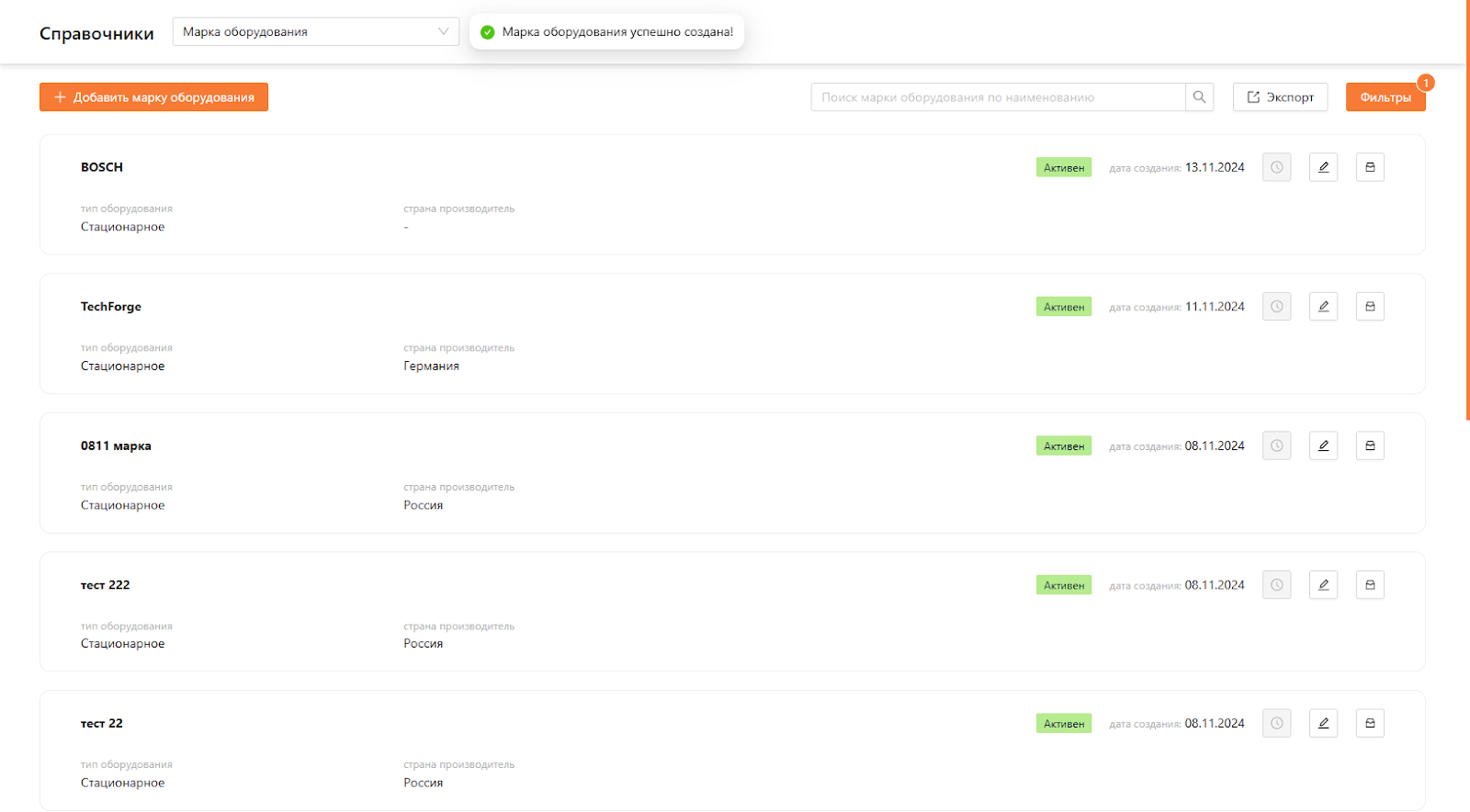 Система сообщит о сохранении марки оборудования и откроет список марок оборудования (см. рисунок 12).