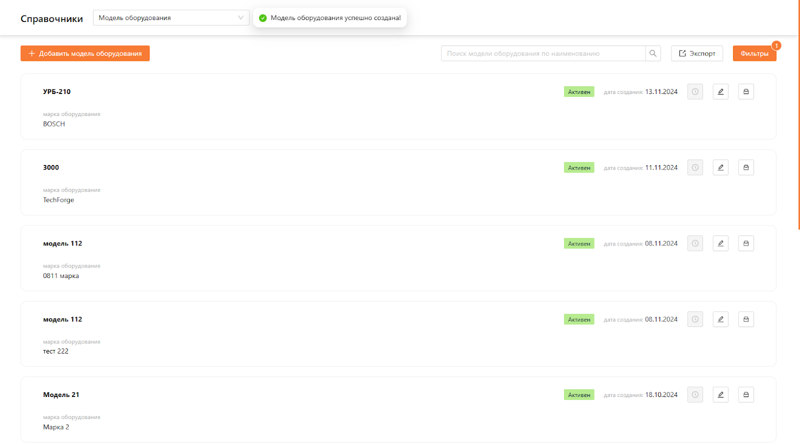 Система сообщит о сохранении модели оборудования и откроет список моделей оборудования (см. рисунок 15).
