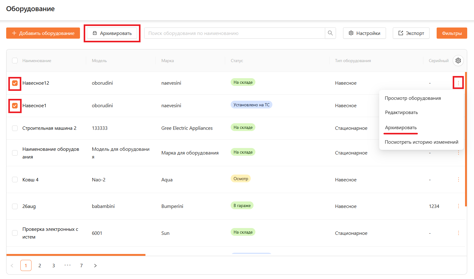 Для массового или одиночного архивирования необходимо выбрать оборудование и нажать на кнопку “Архивировать” либо нажать на кнопку справа и выбрать "Архивировать"(см. рисунок 16).