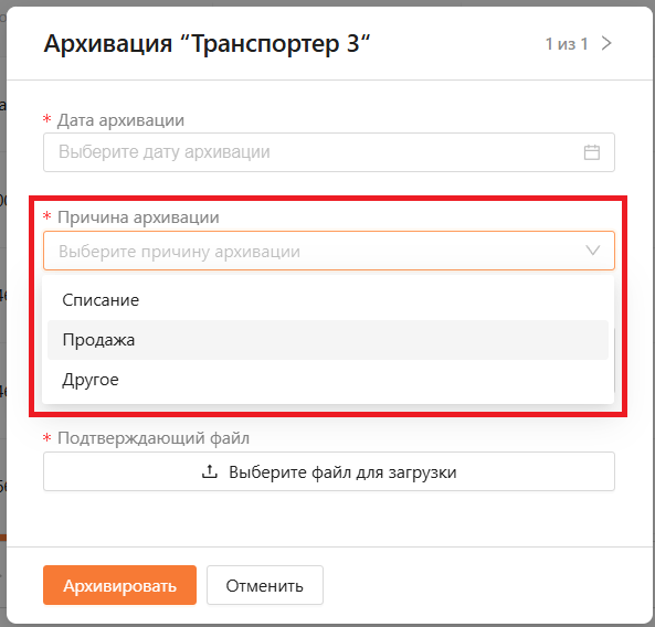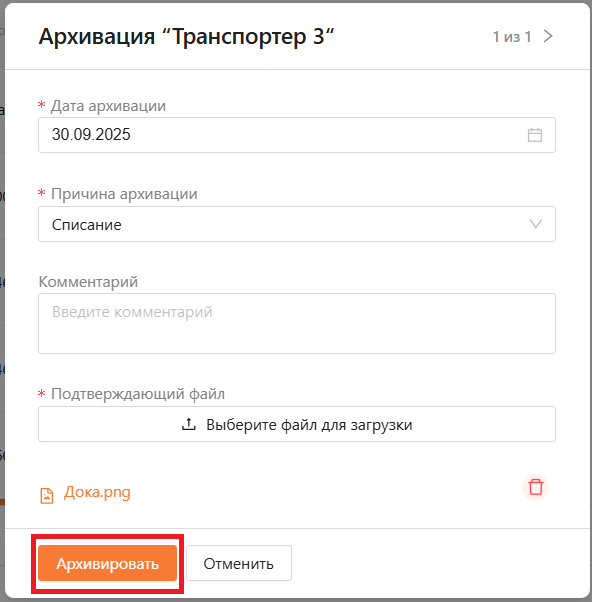 Выберем причину “Списание” и заполняем все обязательные поля. Далее нажмем на кнопку “Архивировать” (см. рисунок 18).